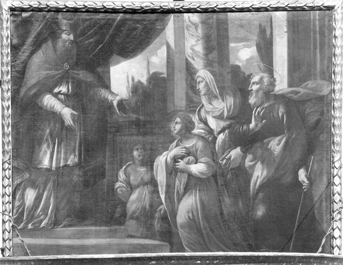 Il dipinto è rinchiuso entro una cornice in legno intagliato e dorato con foglie di alloro e raffigura la Madonna accompagnata al tempio da Sant'Anna e San Gioacchino, insieme a un'ancella. Su due scalini, in piedi, li accoglie il sacerdote sullo sfondo di una cortina aperta. Dietro al gruppo delle figure si intravvede, al di là delle colonne del tempio, un paesaggio con alberi