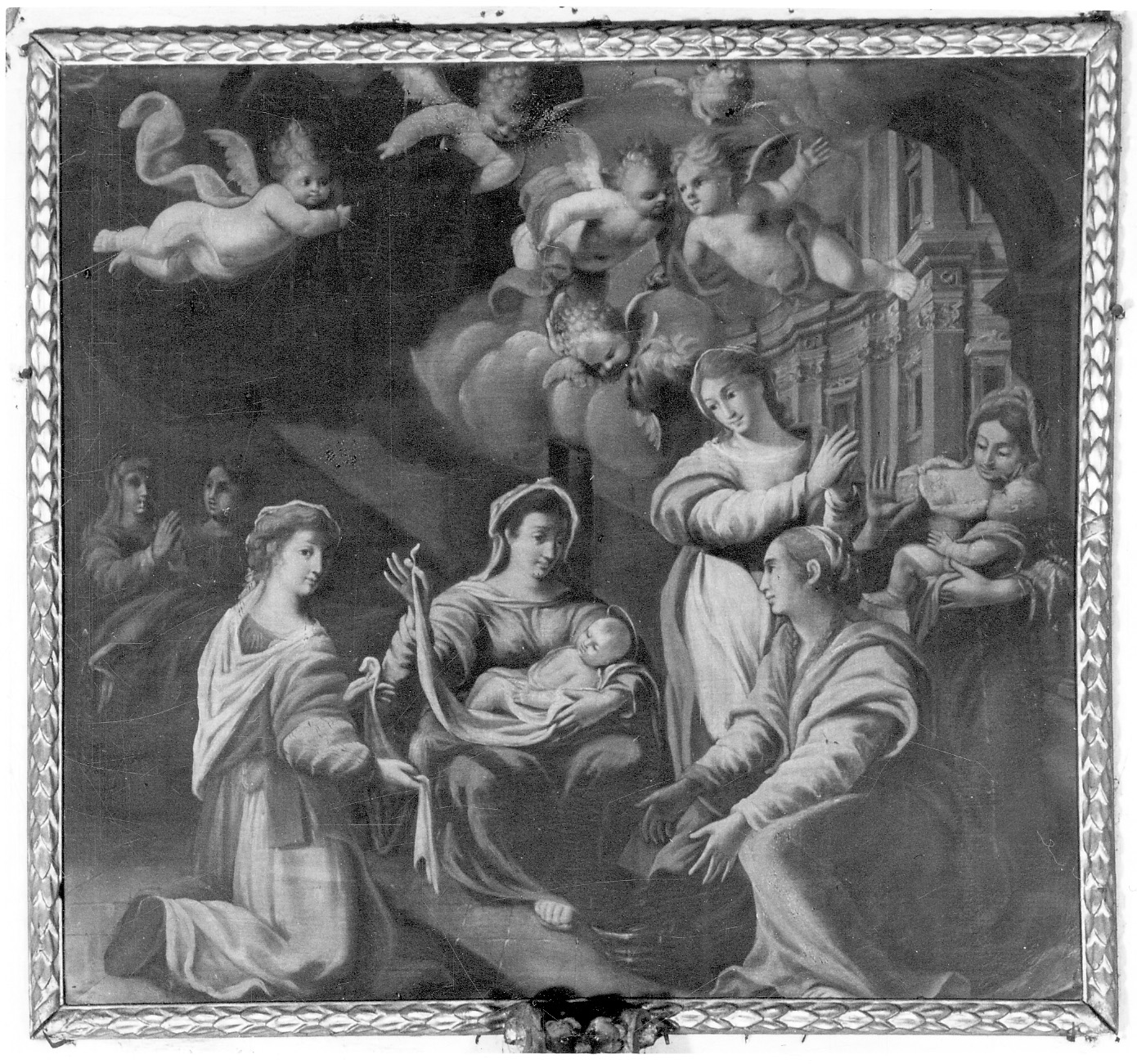 Il dipinto è contornato da una cornice dorata a foglie di alloro scolpite. E'raffigurato un gruppo di donne attorno alla neonata Madonna, che una figura femminile seduta regge tra le braccia. Sul fondo a sinistra si scorge Sant'Anna distesa nel letto assistita da un'ancella. A destra un palazzo fa da quinta architettonica all'avvenimento, che viene osservato da numerosi angeli in volo tra le nuvole. I colori sono opachi sul fondo e vivaci con la luce; negli abiti prevale il rosso