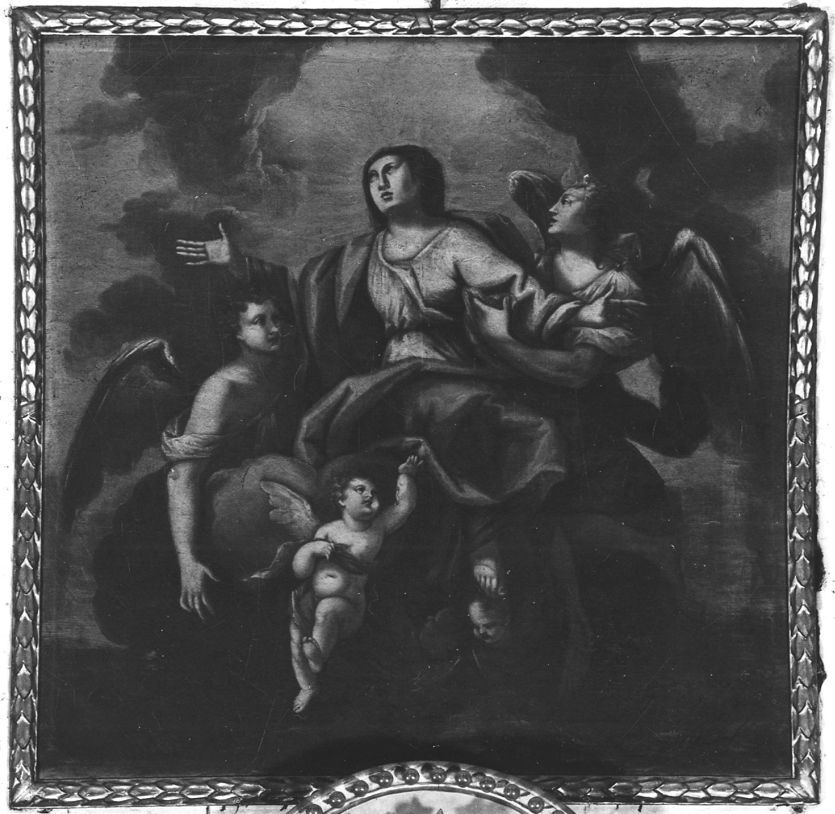 Contro uno sfondo di nuvole dense e scure in basso, solo illuminate dall'alone luminoso attorno alla sua figura, la Madonna viene portata in cielo da due grandi angeli. La veste rossa contrasta con il mantello blu, ampio e dalle rigonfie pieghe; ai suoi piedi due angioletti e un terzo appena abbozzato tra le nuvole completano la composizione. Una cornice in legno, intagliata con un motivo a foglia di alloro, rinchiude la tela