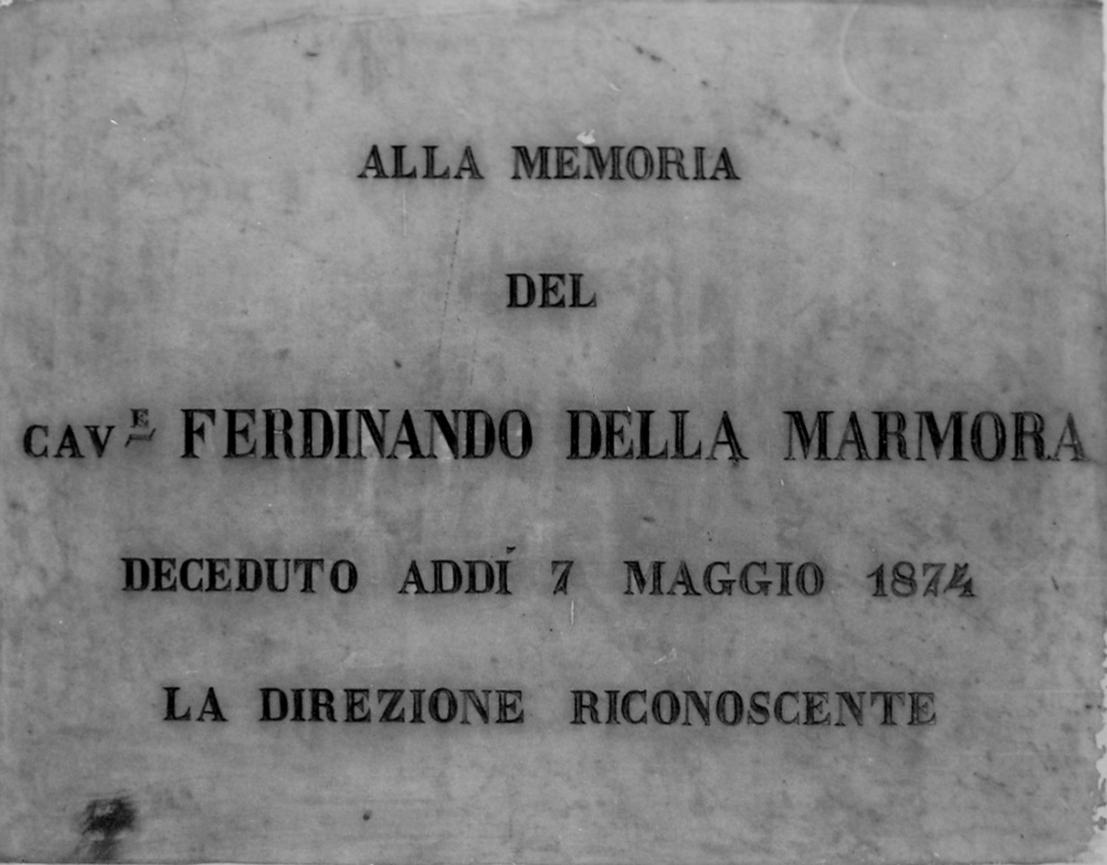 - ISCRIZIONI Al centro - ALLA MEMORIA/ DEL/ CAV.E FERDINANDO DELLA MARMORA/ DECEDUTO ADDI' 7 MAGGIO 1874/ LA DIREZIONE RICONOSCENTE - lettere capitali - a solchi -