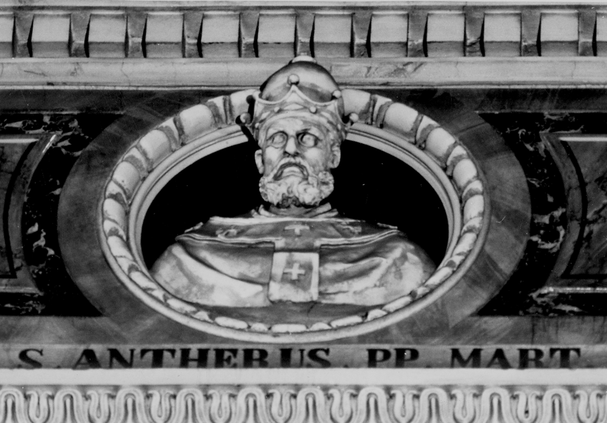 - NOTIZIE STORICO CRITICHE La scultura fu eseguita da Giuseppe Argenti insieme ad altre 26 fra il 1867, anno dell'atto capitolare che permette l'attuazione dei busti, e il 1869 anno dei pagamenti allo scultore per i suoi lavori già eseguiti L'Argenti è scultore di estrazione lombarda facente parte di una famiglia di scalpellini di Viggiù, dei quali il più famos è Giosuè. I suoi lavori si svolsero in gran parte a Novara (Novara, Archivio di Stato, M. DI CONSOLE BALDINO, Uno scultore neoclassico nella Novara dell'800, Giuseppe Argenti; M. DELL'OMO ROSSINI, Note sullascultura nella Basilica di S. Gaudenzio a Novara, in "Bollettino storico per la provicia di Novara, 1980, pp. 117-132), come ricca,mente documentato in due almanacchi locali, l'Iride novarese e lo Spigolatore novarese, tanto che il volto ottocentesco di Novara appare fortemente impregnato di codesto maestro. Argenti vide i primi insegnamenti presso l'Accademia Braidense, in particolare stto la guida di Pacetti. Ma le sculture del duomo novarese sono lavoro di pienamaturità, fortemente caratterizzate nell'espressine, ancora memori nella loro imponenza della statuaria romana. I santi qui rappresentati sono personaggi che appartengono alla storia ecclesastica locale, o di cui sono consercate le reliquie, secondo un progetto che in maniera simiòle proprio nell'Ottocento era maturato nella Basilifca di S. Gaudenzio della stessa città, anche se in codesto caso si lascia maggiormente spazio ai personaggi dell'Antico e Nuovo Testamento (sulle sculture si veda Novara, Archivio della Cattedrale, Acta Capitulare 1867-1876, 1867; Novara, Archivio della Cattedrale, Fabbriceria Amministrazione, teca n. 79, Rendiconto 1869-1870; Novara, Archivio della Cattedrale, Libro giornale di cassa dal 1867 al 1871, n. 4; G. BARLASSINA, A. PICCONI, Le chiese di Novara, Novara 1933, p. 22). Il santo raffigurato fu papa tra il 235 e il 236 e forse morì durante la persecuzine di Massimino. Suoi ritratti sono conservati presso la Basilica romana di S. Pietro fuori le mura e a Superga, nella cosidetta Ssala dei Papi. Con tutta probabilità la presenza del santo nella cattedrale novarese è legata ad una presenza di reliquia nella diocesi, giunta forse con la missine di Bascapé di inizio Seicento. Bascapè non da indicazioni precise e, in questa sede, non si è in grado di fornire dati più dettagliati sulla questione (M. V. BRANDI, M. C. CELLETTI, Antero, in Biblioteca Sanctorum, V. II, Roma 1962, pp. 51-56)