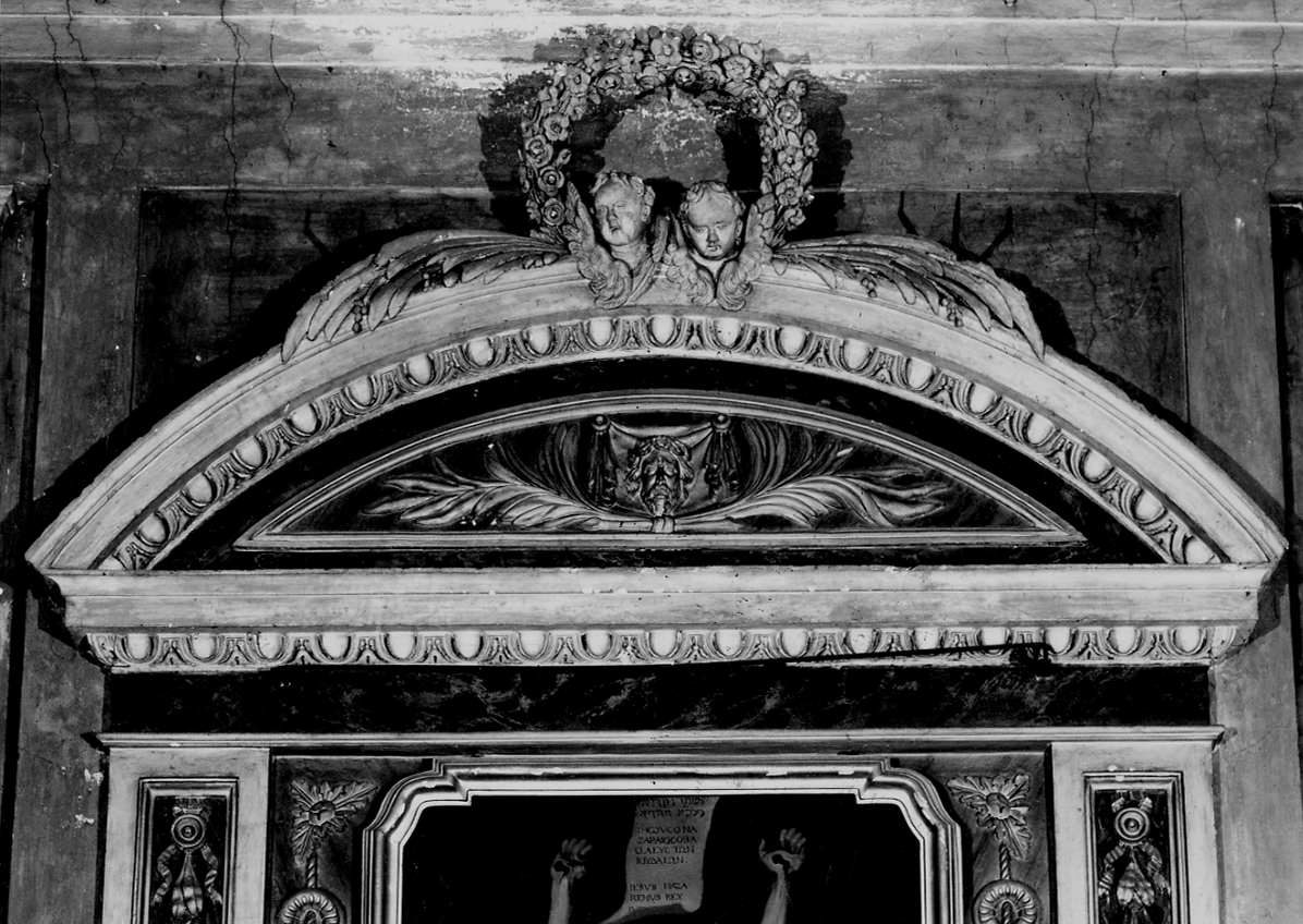 L'ancona termina con un timpano profilato in marmo bianco scandito da un motivo decoratoivo a stucco, con, all'interno, il velo della Veronica poggiuante su due palme incrociate