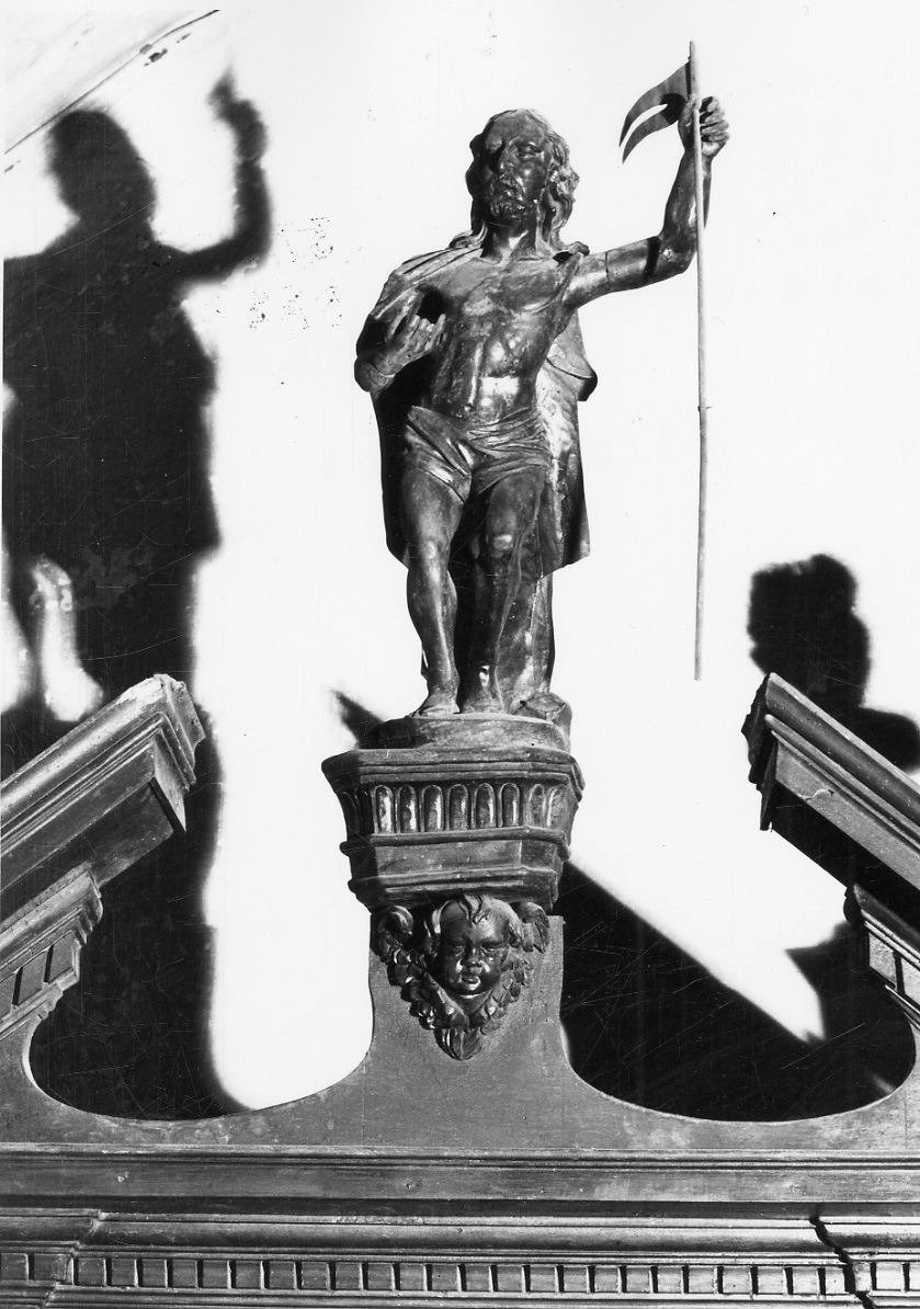 Al centro del timpano è la figura del Cristo risorto con lo stendardo in mano e ilcorpo celato da perizoma e dal manto appoggiato sulle spalle