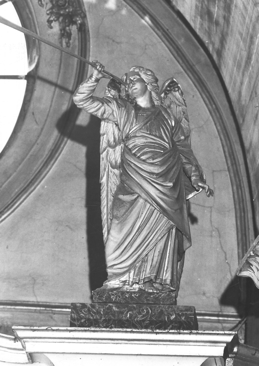 Raffigura l'angelo in piedi, con le ali piegate dietro la schiena, mentre regge con la destra una lunga tromba. Il braccio sinistro è disteso lungo il fianco. Veste un lungo abito con un mantello che gli avvolge le spalle dipinto nei toni del viola, del marrone con profili dorati. Il retro non è lavorato. La statua poggia su un piedistallo a due gradini in legno dipinto a finto marmo