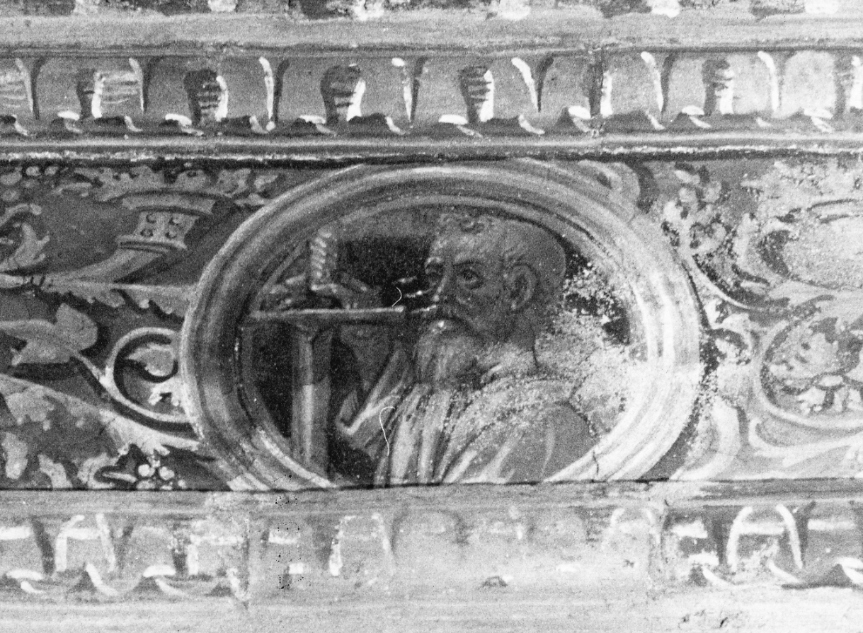 Figura a mezzo busto di S. Paolo, posto di tre quarti verso sinistra. La figura barbuta regge tra le mani una lunga spada