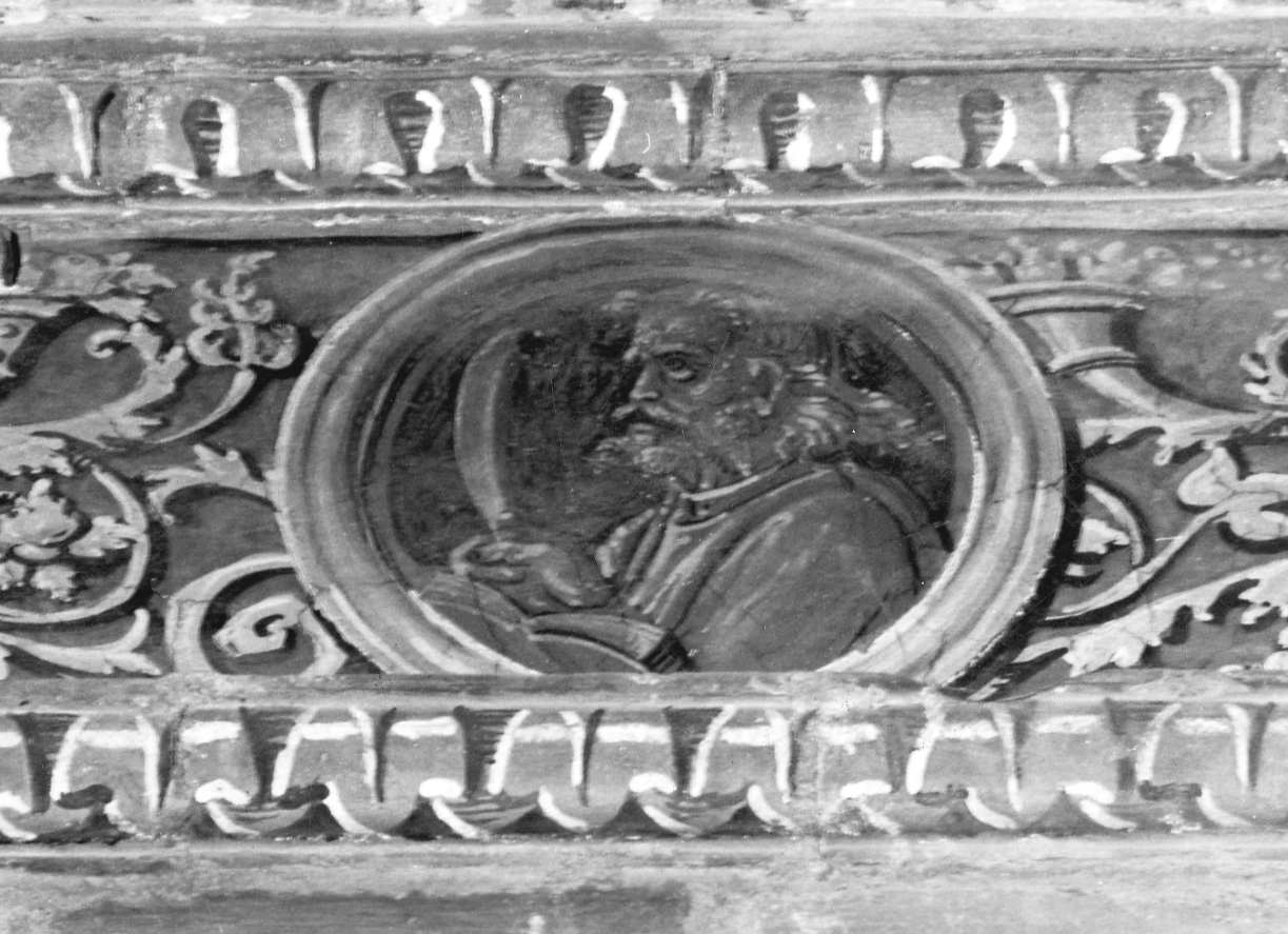 Figura a mezzo busto di S. Bartolomeo, posto di profilo verso sinistra. La figura barbuta regge tra le mani un coltello