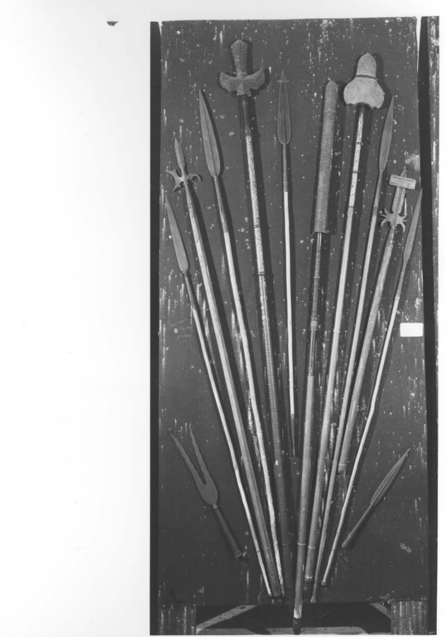 - NOTIZIE STORICO CRITICHE La scheda documenta lo stato del pannello con trofeo d'armi prima dell'inverno 1989: in quell'occasione il pannello è stato rimosso ed è stato operato un intervento di emergenza per fermare il degrado delle armi con protettivo rimovibile in ragia minerale. Al momento della schedatura di revisione (2002 e 2016) le armi si trovano nel medesimo deposito, distaccate dal supporto ed avvolte in carta velina ed il pannello, che non è stato riutilizzato, versa in pessimo stato di conservazione