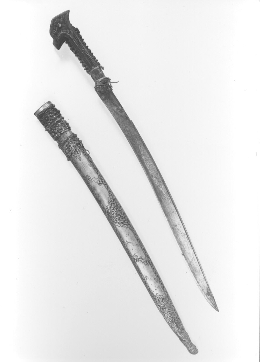- NOTIZIE STORICO CRITICHE Il coltellaccio è di tipo yataghan, ossia un'arma bianca lunga turca e balcanica con taglio ad andamento concavo, forse derivata dall'antica Kopis greca: si veda il volumetto "Ferro, oro, pietre preziose. Le armi orientali dell'Armeria reale di Torino", a cura di P. Venturoli, Torino 2001, p. 211; la scheda documenta lo stato del pannello e della composizione d'armi prima dell'inverno del 1989: in quell'occasione il pannello è stato rimosso ed è stato operato un trattamento con protettivo rimovibile in ragia minerale. Al momento della schedatura di revisione (2002 e 2016) le armi si trovano nel medesimo deposito, distaccate dal supporto ed avvolte in carta velina ed il pannello, che non è stato riutilizzato, versa in pessimo stato di conservazione. Le armi provenienti dall’Impero Ottomano, conservate presso il Castello di Racconigi, sono parte dei doni inviati dal Sultano Abdul-Hamid II a re Vittorio Emanuele III nell’agosto del 1904. La missione diplomatica consegnò complessivamente ventidue quintali tra fucili, archibusi, artiglierie, spade, asce, lance, revolver, armature, corazze, maglie d’acciaio, elmi in metallo e in stoffa. Esse vennero presentate al sovrano italiano disposte in vetrine foderate in velluto cremisi in una sala attigua a quella del biliardo del Castello di Racconigi. (v. La Missione turca dal Re. I doni del Sultano, Corriere della Sera, 22/08/1904, p. 1; David G. Alexander, Islamic Arms and Armor in the Metropolitan Museum of Art, Metropolitan Museum of Art, New York 2015)