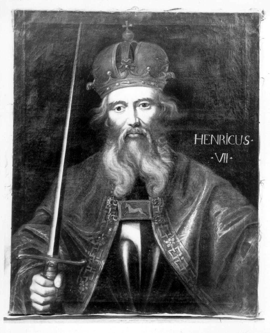 - NOTIZIE STORICO CRITICHE Il dipinto fa parte di un gruppo di ritratti di sovrani stranieri, alcuni di formato rettangolare, altri ovali, oggo divisi tra varie residenze (Stupinigi, Sarre, Racconigi, Moncalieri) (C.E. Bertana 1990). In particolare i dipinti ovali rappresentano i sovrani di Francia e i sovrani di Inghilterra. Questi ritratti alla fine dell'Ottocento sono documentati suddivisi fra Palazzo Reale di Torino (sovrani di Francia: Hugues Capet DC 234, Jean (Giovanni senza Terra) DC 233, Henry I DC 227, Philippes I DC 224, Louys VII DC 230, Louys VIII DC 240, Louys IX DC 26, Philippes III DC 227, Philippes VI DC 231, Jhan DC 239, Louys Le De Bonnaire DC 28, Raoul DC 238) e il castello di Racconigi (sovrani di Inghilterra e Francia: Etienne R 338, Richard III R 357, Philippes 5 R 349, Edgar R 339, Edouard I R340, Henrie III R 341, Louys X R 350, Jacque II R 342, Clouys I R 343, Louys 11 R 344, Edovard III R 346, Charles VII R 345, Francois 2 R 348, Philippes 2 R 341, Ferdinandis Imp Rom II R 352, Elisabet R 355, Louis 6 R 353, Henri VII R 356), come evidenziano i numeri di inventario storici qui riportati che trovano corrispondenza nella "Rubrica per nomi di autore degli oggetti d'arte esistenti nelle Reali Residenze del Piemonte" (AsTo Sezioni Riunite Casa di Sua Maestà Inventari 12924). Fra i dipinti ovali presenti a Racconigi è possibile individuare due ritratti stilisticamente più vicini alla serie oggetto di questo studio. Si tratta dei dipinti con Ferdinandus II Imp. Rom (R 1226), e di quello con Iaque II (R 1217). ||Il ritratto qui studiato fa parte del gruppo di tele di formato rettangolare, in cui sono effigiati imperatori del Sacro Romano Impero, due duchi di Stiria della linea leopoldina degli Asburgo, tre reali di Spagna e infine sei re inglesi. Queste opere sembrano documentare l'interesse per la ritrattistica dei personaggi illustri di cui esistono numerosi modelli e repertori a partire dalla serie Gioviana e, nel caso delle figure di imperatori, da quella dei Cesari e delle imperatrici, realizzata da Tiziano, e poi incisa da Egidio Sadeler. Della serie degli imperatori di Tiziano sono attestate copie anche a Palazzo Reale di Torino fin dal Seicento (..). Il nucleo di queste opere presenti a Moncalieri originariamente era composto da 34 tele (F. Binda 2005-2006) ed è costantemente presente al castello nell'arco di tempo compreso fra il 1824 e il 1908. I dipinti si ritrovano infatti negli inventari storici del nella residenza a partire dal Catalogo dei Quadri (1824), quando erano collocati nella Camera privata del Re. Successivamente alla metà dell'Ottocento vennero collocati nella Camera d'aspetto; infine intorno al 1860 furono disposti nella Camera di Parata di Sua Maestà. Nel 1879 si trovavano invece al piano terreno nella sala n. 50. Spostati a Palazzo Reale di Torino nel corso del Novecento, sono stati riportati al castello di Moncalieri per volere di Cesare Enrico Bertana nel 2000, allestiti nell'appartamento di Vittorio Emanuele II. Questo dipinto presenta un'impostazione omogenea a quella degli altri appartenenti a questa serie, i cui soggetti sono raffigurati a mezzo busto, di profilo, di tre quarti o frontalmente (come avviene in questo caso), quasi sempre in armatura, e sono identificati da una iscrizione. Come è emerso dai recenti restauri i dipinti appaiono omogenei anche per supporto e tecnica pittorica adottata. Tutti sono vincolati a un telaio a incastri fissi, con regoli di ridotto spessore (1 cm) e privi della smusssatura dello spigolo interno a contatto con il supporto tessile. (Relazione dei restauri, 2012). La tela rappresenta Enrico VII di Lussemburgo (1275-1313). L'iconografia di questo sovrano, così come quella degli altri imperatori più antichi si rifà probabilmente al modello dei sovrani incisi nel 1664 a corredo del testo "Del Regno d'Italia sotto i barbari" di Emanuele Tesauro pubblicato a Torino da Bartolomeo Zavatta