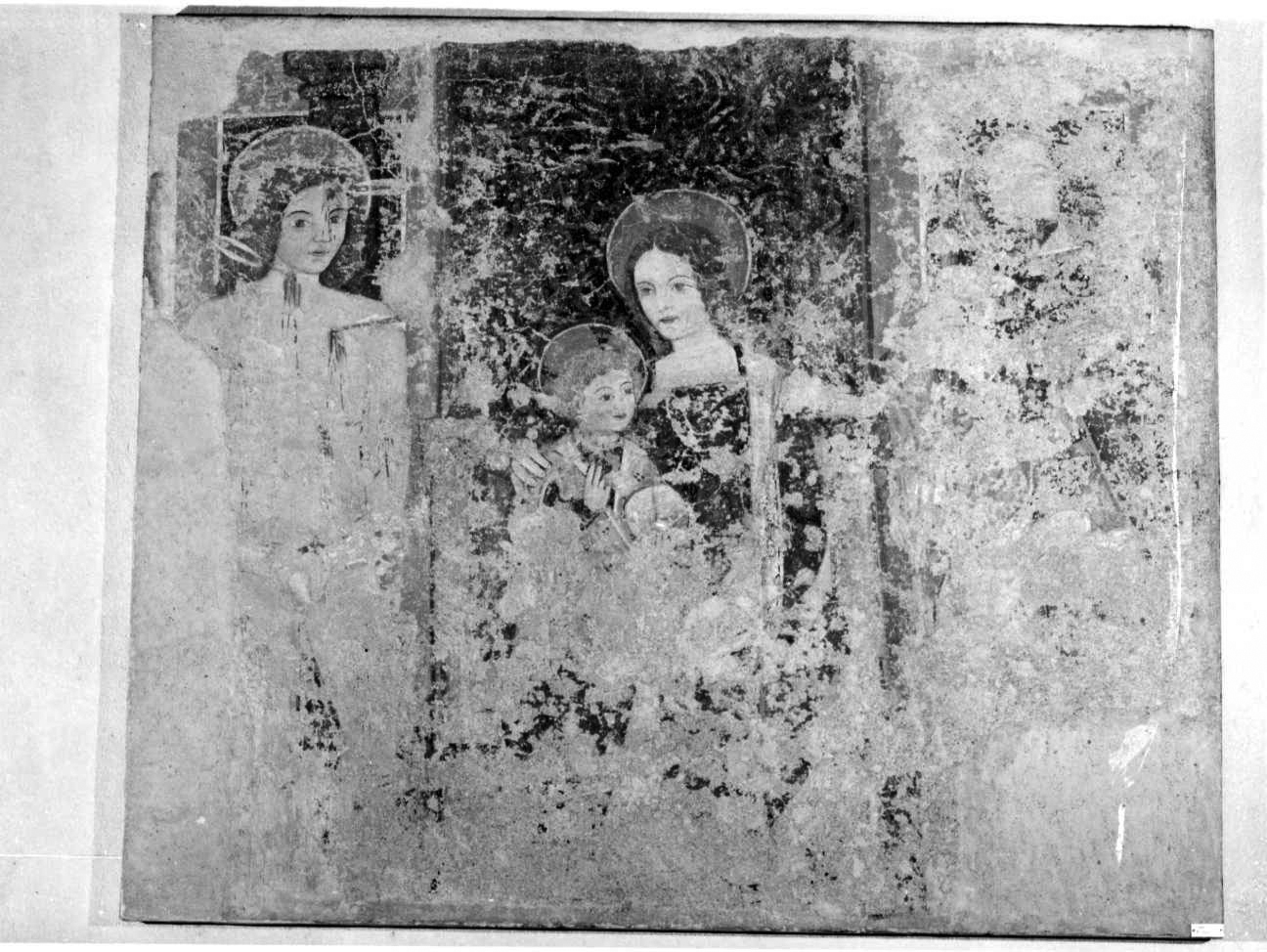 Affresco staccato raffigurante la Madonna in trono col Bambino benedicente. Sul lato sinistro è San Sebastiano alla colonna, su quello destro San Fabiano (poco leggibile). Sul fondo drappo bruno a decori ocra sul trono