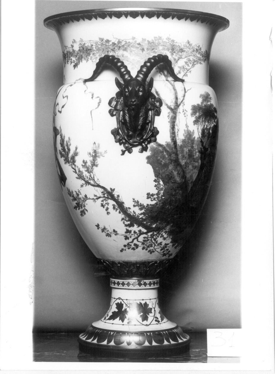 Corpo ovoidale raccordato all'alto piede strombato mediante un collarino in bronzo dorato con motivo fitomorfo, collo svasato con orlo espanso, manici a testa di stambecco in bronzo dorato. Decorazioni su fondo bianco; sulla metà anteriore del corpo è dipinto in policromia un paesaggio con due figure a cavallo e cinque a piedi che effettuano una battuta di caccia cui corrisponde, sulla parete posteriore, un trofeo di caccia. L'orlo esterno della bocca è decorato da un giro di foglie alternativamente di edera e di geranio in oro, mentre sul collo corre una ghirlanda di edera policroma. Il piede presenta, a partire dal basso, tre fasce continue di ornati dorati: a foglie ovate e lanceolate, a tralcio d'edera e rombi