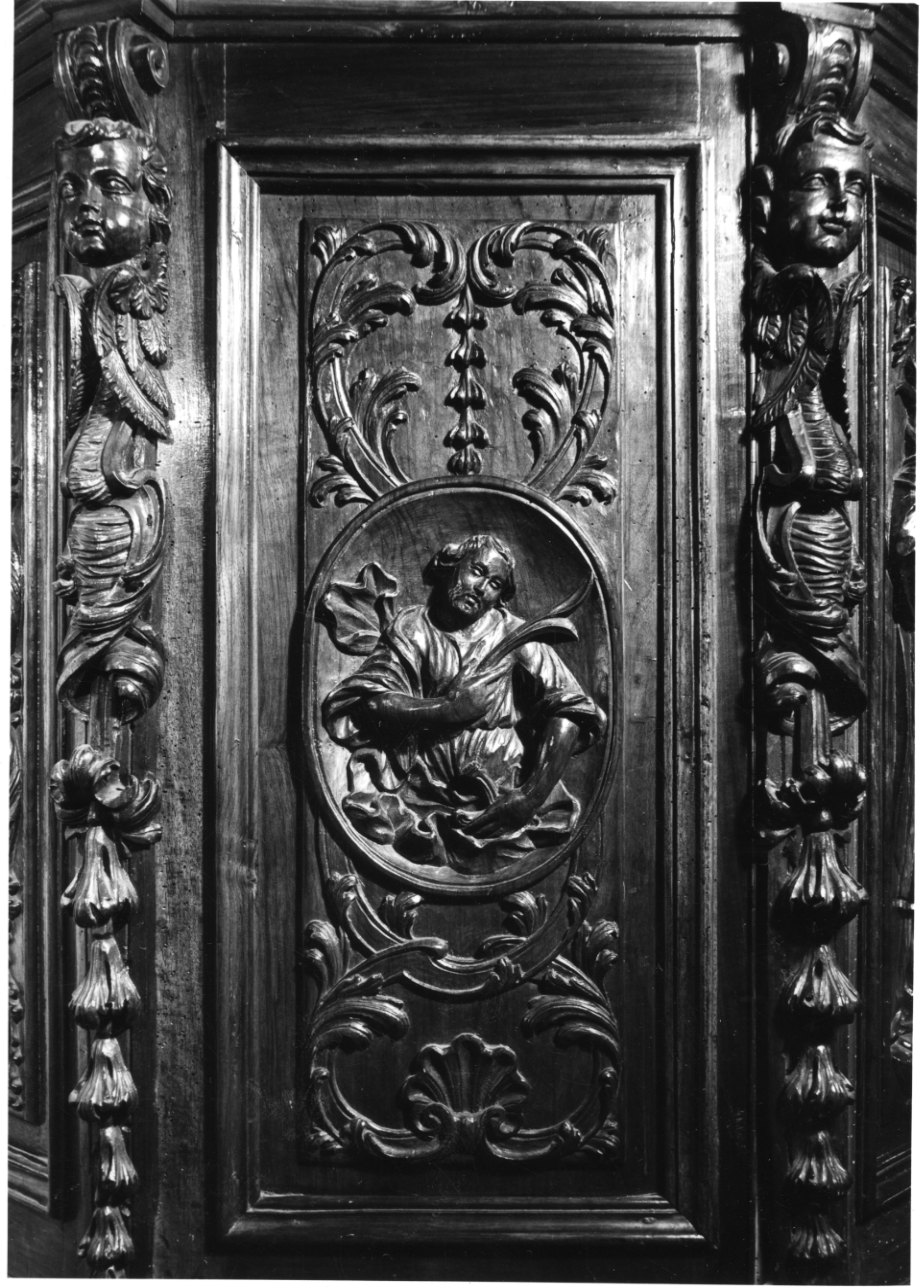 - NOTIZIE STORICO CRITICHE Non è documentata l'esecuzione di questo tempietto del quale nel 1644 si auspica il più presto possibile un'elegante edificazione in noce in corrispondenza del sottostante vaso il Card. Cesare Monti in occasione della sua visita pastorale nella Colleggiata (A.P.A., C. Monti, Visita pastorale, 1641, f9t). Anche G. Ponzone, Arciprete tra il 1629 e il 1652, nella relazione dal titolo: "pensieri intorno alli Vasi Santi Battesimali della Colleggiata Di S. Maria d'Arona, alla quale fu portato S. Carlo" (G. Ponzone, pensieri intorno alli Vasi Santi Battesimali della Colleggiata Di S. Maria d'Arona, A.P.A., in AA.VV., San Carlo e la Sua Arona, Arona 1984, p. 32) fa riferimento ad un ciborio, non identificabile con quello attuale che probabilmente lo ha sotituito: "In Arona, dove nacque e fu battezzato (S. Carlo), si facciano per onorarlo fregiare i suddetti vasi con sculture ben formate nel ciborio e con pitture nelle campate della cappella, dalle quali pitture e sculture sia rappresentata la nascita corporale resa splendente dal cielo con miracolose luci e la nascita spirituale di S. Carlo nella quale ricevè i primi fondamenti della grazia...". Nel 1749 Pozzobonelli menziona l'elegante ciborio in legno al di sopra della vasca ottagonale, rivestito all'interno e all'esterno di seta bianca e fornito di tutto l'occorrente per l'amministrazione del Battesimo (A.P.A., Pozzobonelli, Visita pastorale, 1749, p. 7). Tale descrizione viene ripresa nelle relazioni del XIX secolo e del XX secolo. (A.P.A., Morozzo, Visita pastorale, 1821, f12v; A.P.A., Lissandrini, Relazione sulla Parrocchia di Arona, 1854, Aggiunte alla relazione, p. 7; A.S.D.N., G. Gamba, Visita pastorale, 1909, f5r). Il disegno preparatorio di battistero a tempietto risalente al 1677, pubblicato da G. Gentile (G. Gentile, Battistero della Collegiata di Arona, in Arona sacra, L'epoca dei Borromeo, Arona 1977, p. 126), potrebbe corrispondere al progetto dell'attuale ciborio rispetto al quale sono analoghe le lesene e le riquadrature con santi, mentre è differente la struttura a due ordini digradanti. Nel primo ordine è compreso il bassorilievo con il Battesimo di Gesù e nel secondo il rilievo con la Trinità in gloria non presenti nella copertura attuale che rielabora elementi seicenteschi nei putti con pendenti. G. Gentile ritiene che quest'ultima per i suoi caratteri stilistici sia risalente al I decennio del XVIII secolo. Essa è analoga al tempietto sovrastante la vasca battesimale della Collegiata di Borgomanero della prima metà del secolo XVIII nella struttura ottagonale, nelle lesene con putti cariatidi e foglie, nelle statue lignee sovrastanti raffiguranti il Battista che battezza Gesù