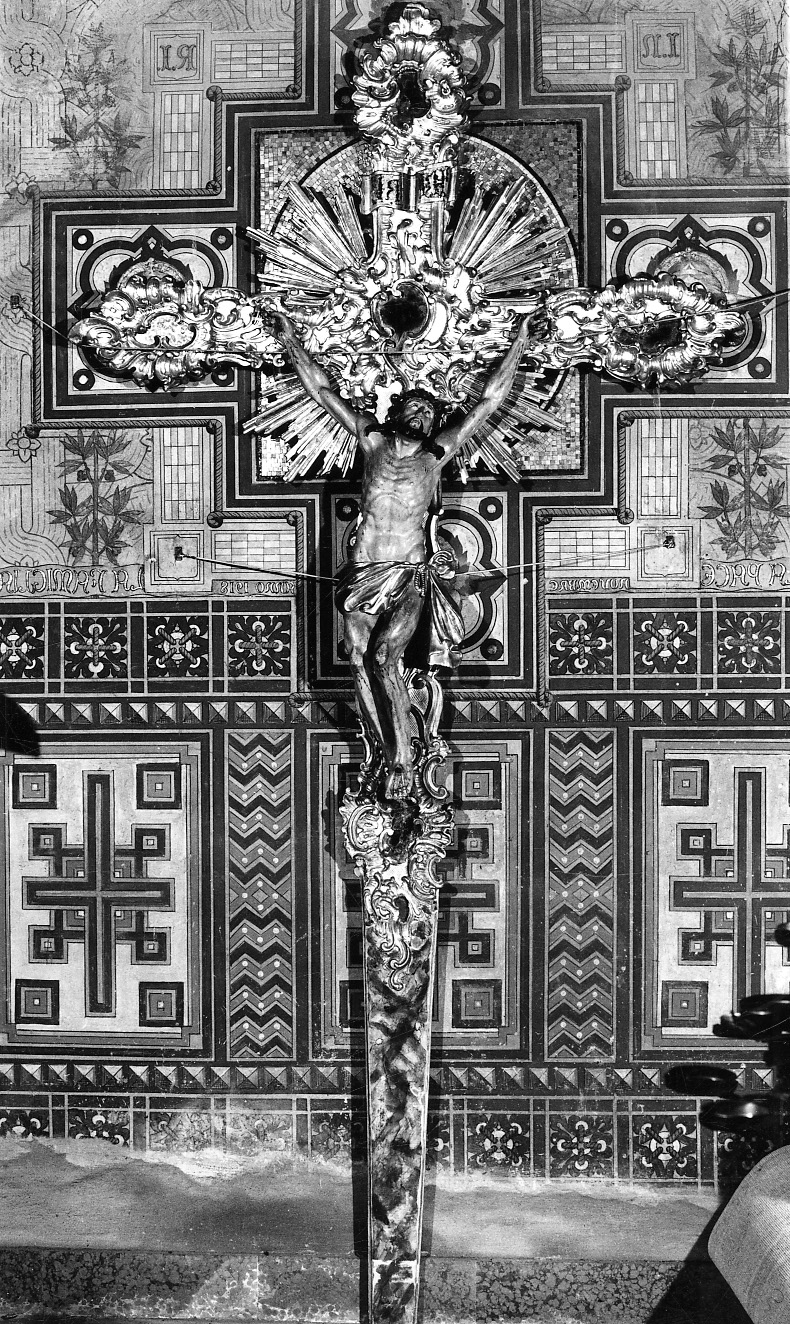 La croce presenta una ricchissima ornamentazione costituita da elementi vegetali e motivi a conchiglia. Le estremità dei bracci sono ornate da specchi. All'incrocio dei bracci uno specchio di maggiori dimensioni è circondato da una mossa decorazione a motivi vegetali dorati e da una fitta e frastagliata raggiera. L'estremità inferiore della croce è dipinta a finto marmo. Il Cristo, raffigurato con le braccia alzate ed il viso rivolto verso l'alto, ha capelli scuri e incarnato rosa pallido. Il perizoma è dorato