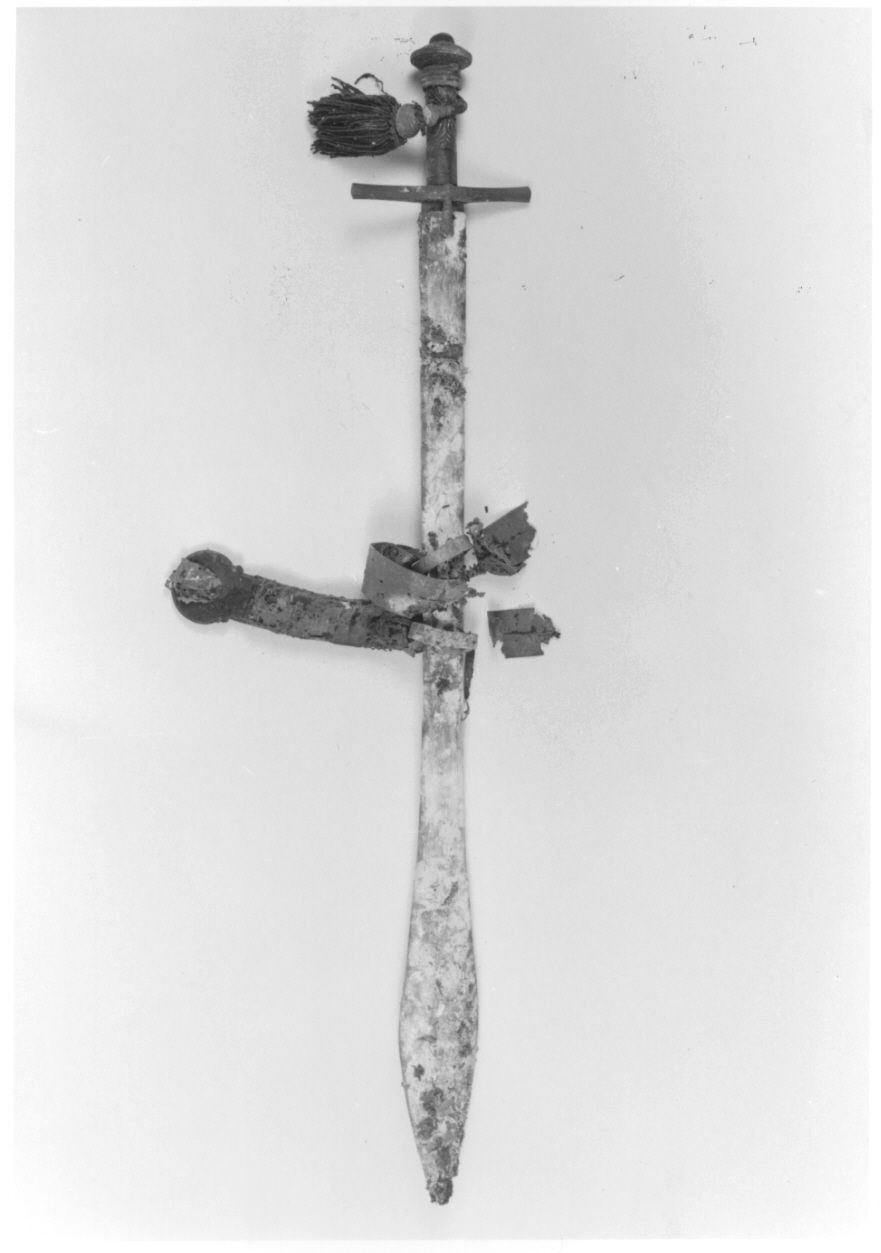 - NOTIZIE STORICO CRITICHE La scheda documenta lo stato del pannello e della composizione d'armi prima dell'inverno del 1988: in quell'occasione il pannello è stato rimosso ed è stato operato un trattamento con protettivo rimovibile in ragia minerale. Al momento della schedatura di revisione (2002 - 2016) le armi si trovano nel medesimo deposito, distaccate dal supporto ed avvolte in carta velina ed il pannello, che non è stato riutilizzato, versa in pessimo stato di conservazione. La spada non è estraibile dal fodero. La Kaskara era un tipo di spada a lama diritta, affilata su ambo i lati, tipica del Sudan e del Ciad