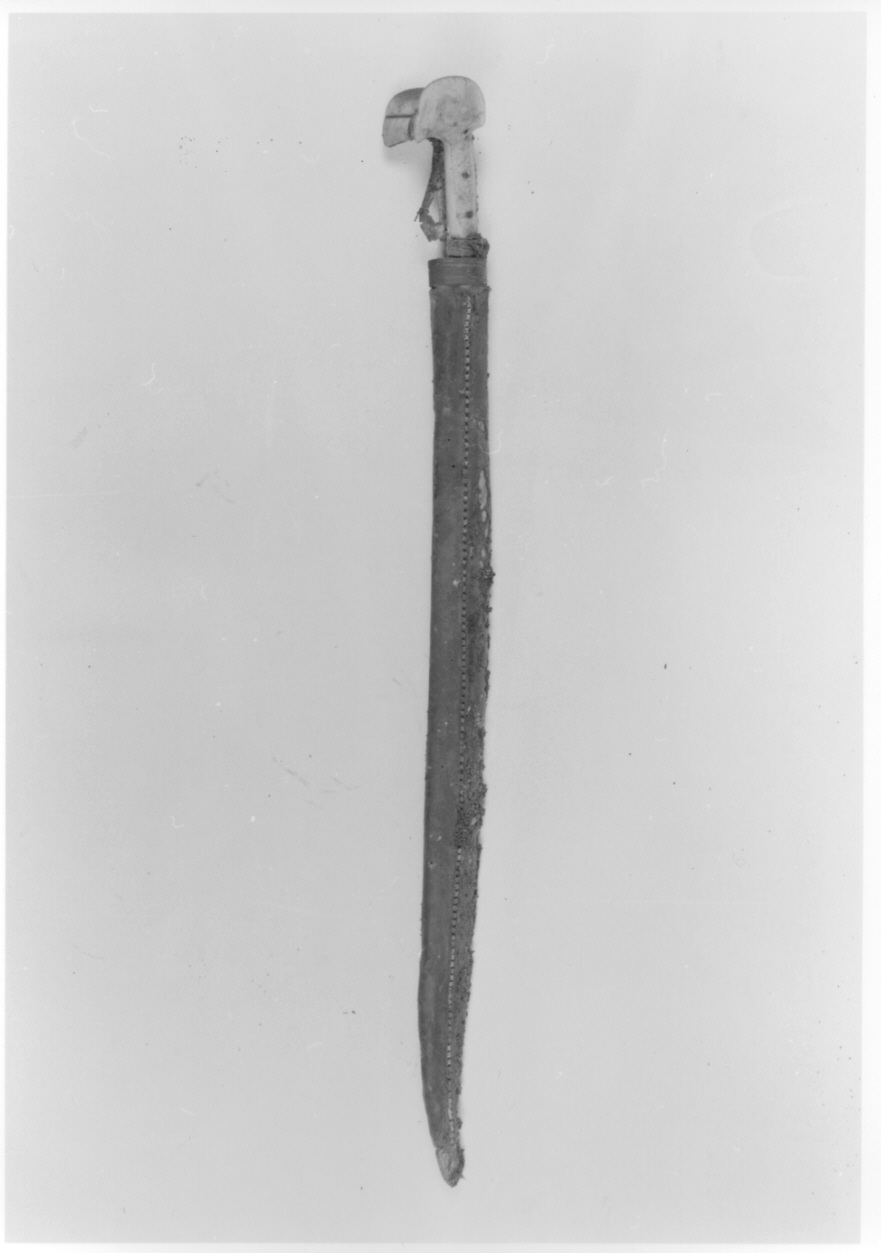 Impugnatura in osso con terminazione a mezzaluna; lama curva in acciaio; fodero rivestito in cuoio liscio con motivo ad intrecci sui fianchi