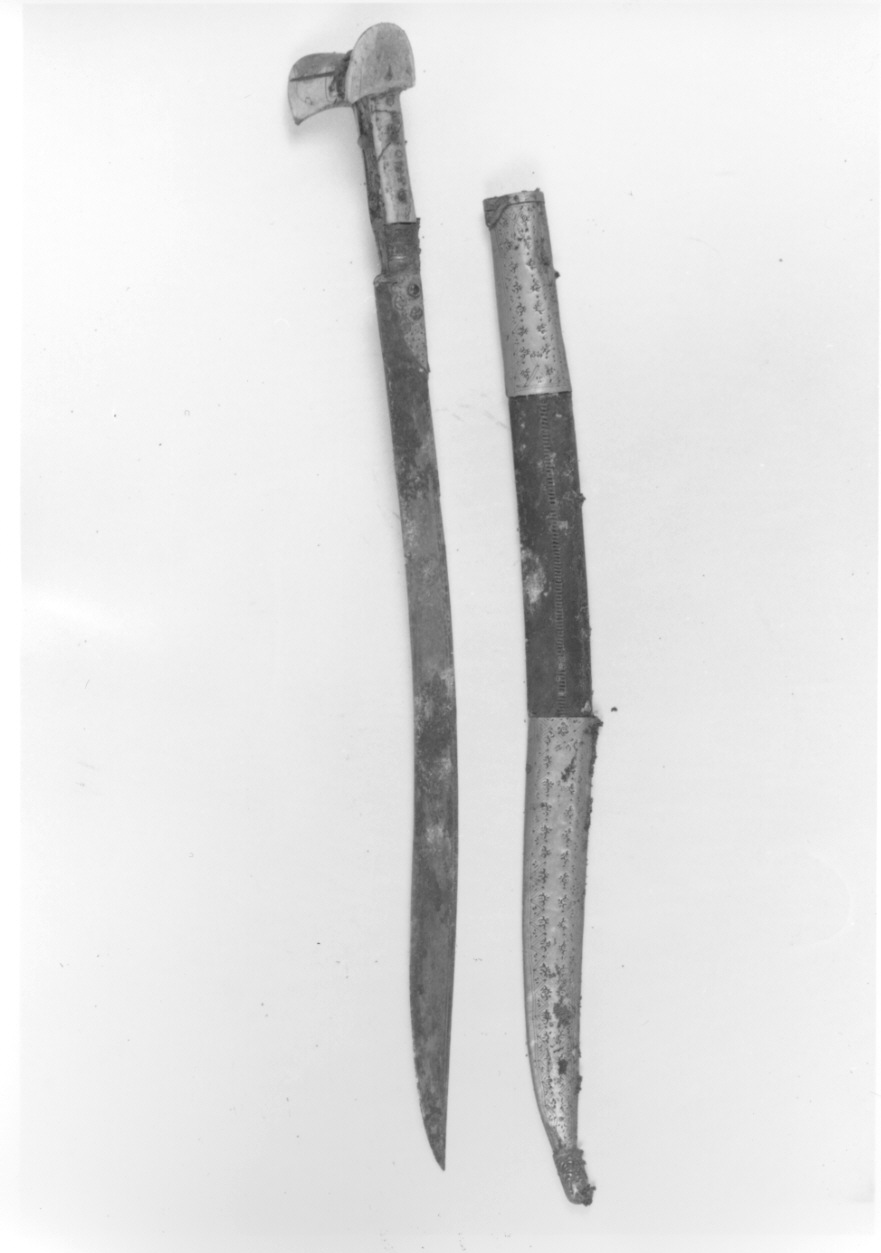 - NOTIZIE STORICO CRITICHE Lo "Yatagan" è un'arma bianca lunga di origine turca e balcanica, con taglio ad andamento concavo, forse derivata dall'antica "kopìs" greca. L'oggetto è riconducibile ad una manifattura turca o di paesi di influenza turca. L'arma si trovava applicata ad un pannello in legno con altri manufatti simili come trofeo d'armi fino al 1989 quando il pannello fu smontato e le armi sottoposte ad un trattamento con protettivo rimovibile in ragia minerale. Al momento delle schedature di revisione (2002, 2016 e 2020) le armi sono state rintracciate in un locale adibito a deposito, distaccate dal supporto ed avvolte in carta velina; il pannello, che non è stato riutilizzato, versa in pessimo stato di conservazione. Le armi provenienti dall’Impero Ottomano, conservate presso il Castello di Racconigi, sono parte dei doni inviati dal Sultano Abdul-Hamid II a re Vittorio Emanuele III nell’agosto del 1904. La missione diplomatica consegnò complessivamente ventidue quintali tra fucili, archibusi, artiglierie, spade, asce, lance, revolver, armature, corazze, maglie d’acciaio, elmi in metallo e in stoffa. Esse vennero presentate al sovrano italiano disposte in vetrine foderate in velluto cremisi in una sala attigua a quella del biliardo del Castello di Racconigi. (v. La Missione turca dal Re. I doni del Sultano, Corriere della Sera, 22/08/1904, p. 1; David G. Alexander, Islamic Arms and Armor in the Metropolitan Museum of Art, Metropolitan Museum of Art, New York 2015)