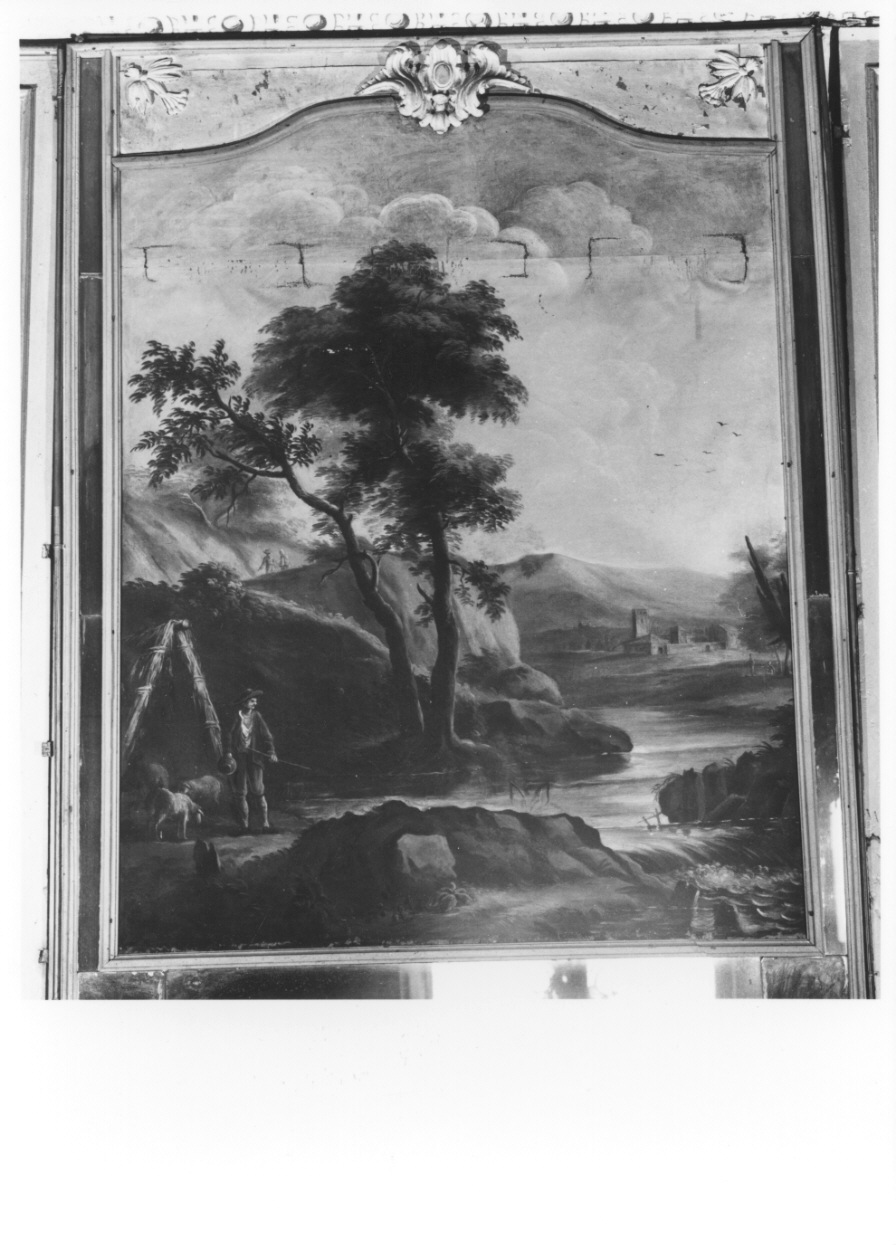 Dipinto a olio su tela, entro cornice, con lato superiore sagomato, inserito in specchiera; vi è raffigurato un paesaggio fluviale con un pastore con il gregge vicino ad una capanna in primo piano, con due grandi alberi al centro, e un villaggio sullo sfondo. Colori dominanti, in varie tonalità: bruno, rosa, azzurro