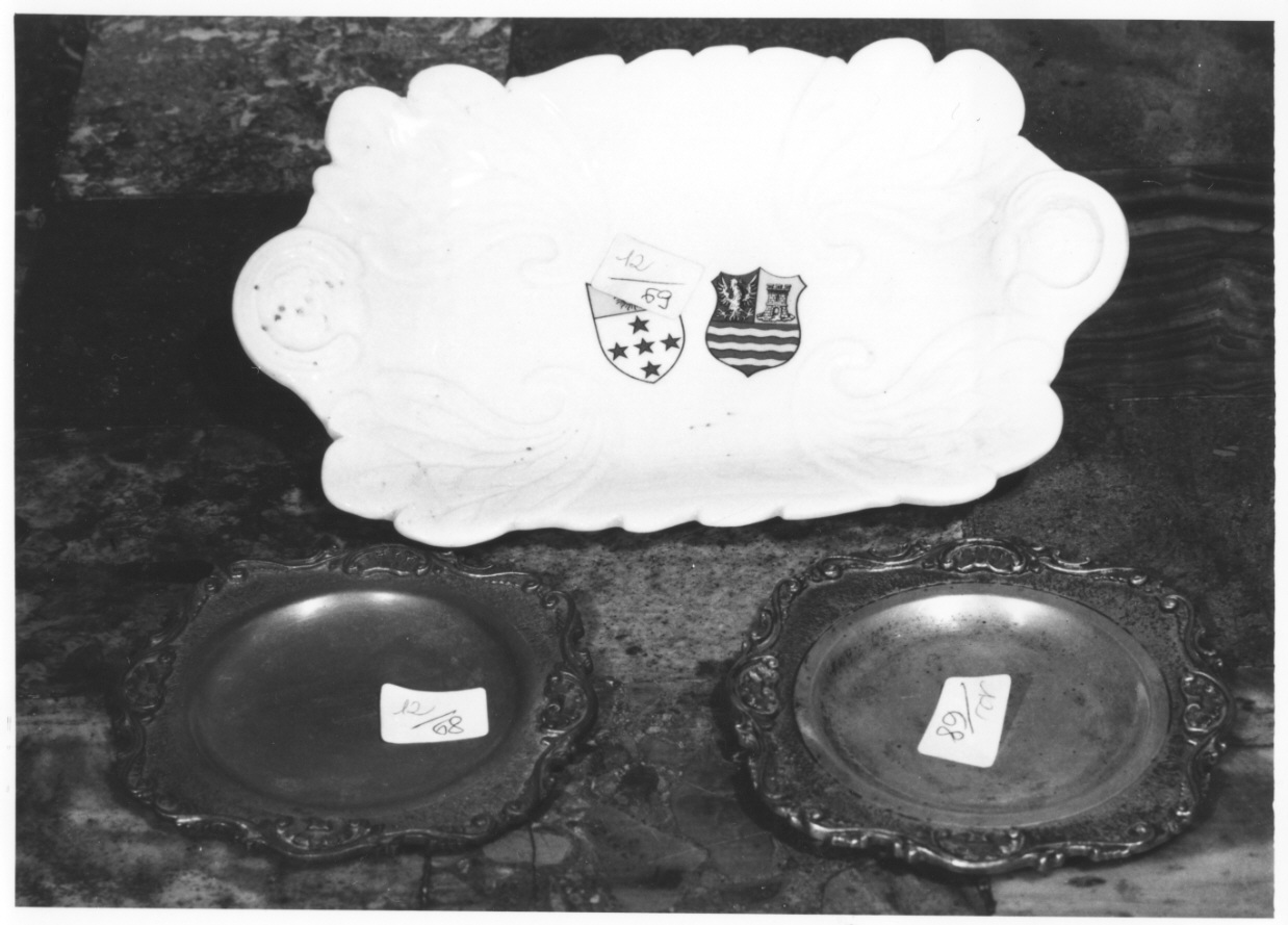 Piattino rettangolare dai bordi sagomati, con cartelle centrali in funzione di manici a decoro dei due lati minori. Dai quattro angoli si sviluppano verso il fondo del piatto sei piume raccolte in fascio e avvolte a formare una voluta terminale sul fondo. Al centro di questo, sono raffigurati due stemmi affiancati