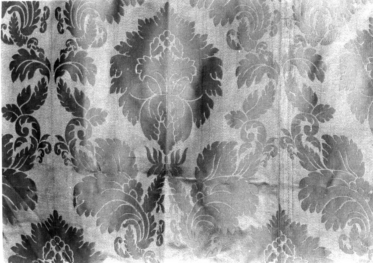 Paramento liturgico composto da un piviale e un velo di calice. Il disegno modulare presenta una griglia a maglie ovali definite da foglie d'acanto, ognuna racchiudente un medaglione vegetale consistente in un ventaglio di foglie con piccola corolla a quattro petali all'interno. Fondo e disegno bianchi. Ordito e trama in seta bianca. Fondo e disegno del tessuto sono prodotti dai fili di un'unica trama in seta del medesimo colore. Fodera in raso di cotone giallo nel piviale e raso di cotone cremisi nel velo di calice. Galloni in seta gialla, eseguita a telaio