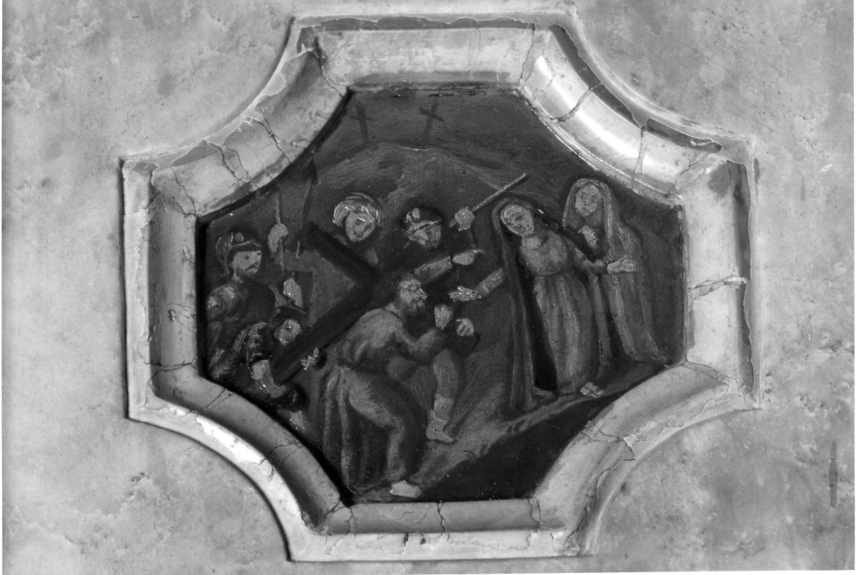 Cristo sotto il peso della croce con soldati armati. A destra la Vergine e una donna