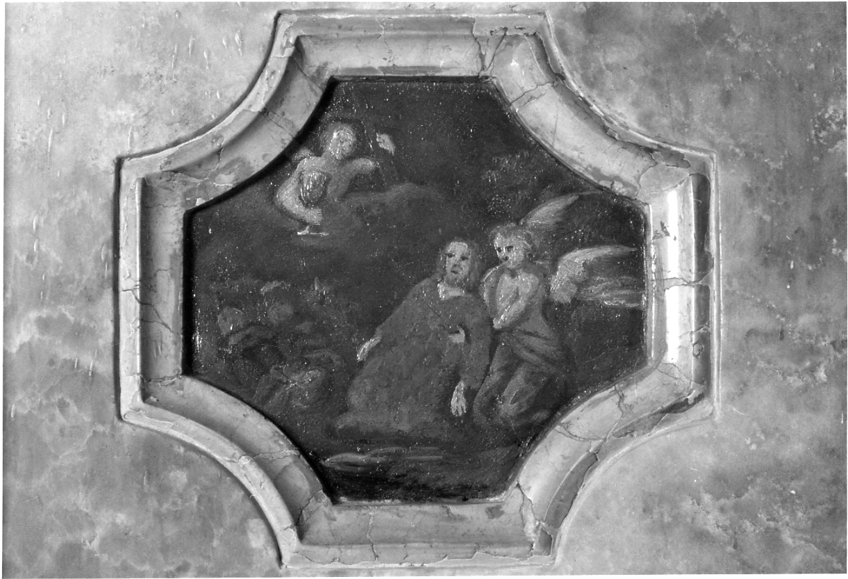 Gesù, genuflesso e orante, viene sorretto da un angelo. Un angelo, tra le nubi, gli mostra la croce e il calice