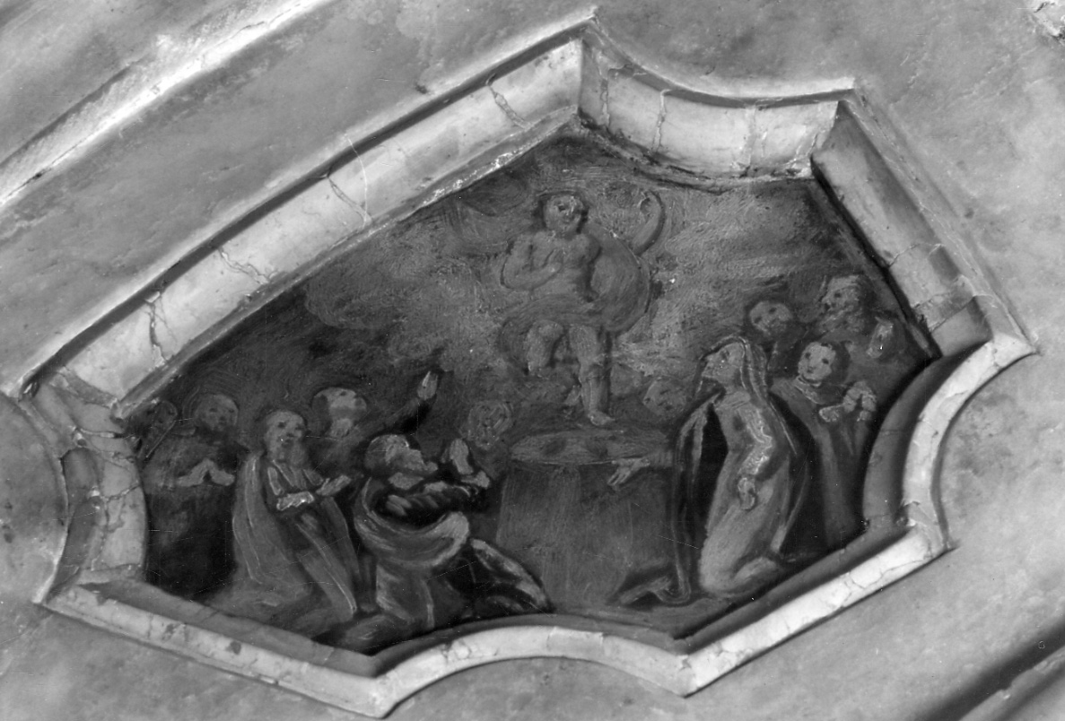 Gesù risorto con fascia rossa; a sinistra e a destra gli apostoli e la Vergine Maria