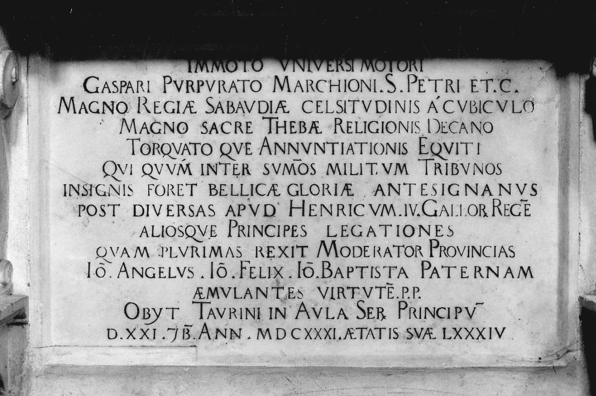 - ISCRIZIONI in basso - IMMOTO UNIVERSI MOTORI / GASPARI PURPURATO MARCHIONI. S. PETRI ET. C. / MAGNO REGIAE SABAUDIAE CELSITUDINIS A CUBICULO / MAGNO SACRE THEBAE RELIGIONIS DECANO / TORQUATO QUE ANNUNTIATIONIS EQUITI / QUI QUUM INTER SUMOS MILITUM TRIBUNOS / INSIGNIS FORET BELLICAE GLORIAE ANTESIGNANUS / POST DIVERSAS APUD HENRICUM. IV. GALLOR REGE / ALIOSQUE PRINCIPES LEGATIONES / QUAM PLURIMAS REXIT MODERATOR PROVINCIAS / IO. ANGELUS. IO. FELIX. IO. BAPTISTA PATERNAM / AEMULANTES VIRTUTE. P.P. / OBYT TAURINI IN AULA SER. PRINCIPU / D. XXI. 7 B ANN. MDCXXXI. AETATIS SUAE LXXXIV - lettere capitali - a incisione - latino