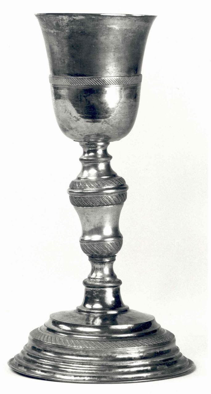 Piede a sezione circolare con profilo modinato; fascia superiore filettata a cesello. Fusto con anelli filettati alle estremità e nodo piriforme allungato ornato da due fasce con filetti perlinati, quella superiore è attraversata da anello. Sottocoppa liscio, profilato da fascia filettata a cesello; coppa dorata internamente. Presenza di doratura anche sul piede e nella decorazione a filetti del nodo