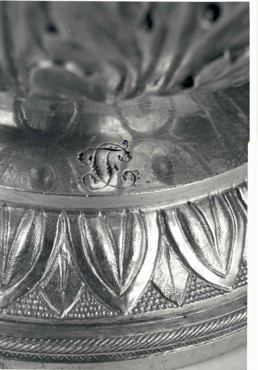 - NOTIZIE STORICO CRITICHE [continuazione DESO] L'oggetto è conservato entro custodia formata da una base, poggiante su quattro piedi circolari in metallo dorato, a tronco di cono in cartoncino rivestito in pelle zigrinata verde (diametro 14.2/ altezza 9) e da un corpo floscio in pelle scamosciata avorio con un cordoncino verde all'estremità per chiuderla (altezza 98 ca.). Appare probabile che la coppia di turiboli in esame possa identificarsi, per la descrizione particolareggiata degli stessi, con i due esemplari commissionati, unitamente a due navicelle, espressamente per la cappella della Sindone, nel 1824 a Innocenzo Gaya (notizie dal 1788 al 1853), in quegli anni alla direzione della Regia Oreficeria, del peso di once 153.15 e pagati L. 1036.96 caduno per il solo materiale, per un totale, incluse le navicelle, di L. 5395.92, somma indubbiamente di rilievo. L'anno successivo, a quanto risulta dalla documentazione, gli esemplari vennero poi affidati al Regio incisore Giuseppe Stagnon per incidervi le iniziali del sovrano e l'arme sabauda. Innocente Gaya, contraddistinto dal punzone con il "Re Davide", accompagnato dalle iniziali I G, fu ammesso mastro argentiere nel 1788; nel 1814 venne eletto consigliere della Corporazione torinese ed ottenne, con Regie Patenti, la nomina ad orefice della Real Casa con il permesso di tenere due botteghe, A. Bargoni, Maestri orafi e argentieri in Piemonte dal XVII al XIX secolo, Torino, 1976, pp. 126, 279, fig. G 10; A. Griseri, Argentieri piemontesi a Palazzo Reale, in A.Griseri-G. Romano (a cura di), Porcellane e argenti del Palazzo Reale di Torino, catalogo della mostra (Torino, Palazzo Reale, settembre-dicembre 1986), Milano, 1986, p. 145. Non sono noti, al momento, suoi lavori al di fuori della committenza di corte. La particolare natura della commissione è rilevabile anche dalla presenza di marchi particolari, che non corrispondono a quelli normalmente prescritti dai regolamenti in vigore nel Regno di Sardegna: si tratta, infatti, oltre alla presenza del monogramma con le iniziali del sovrano intrecciate, del punzone relativo al I titolo dell'argento con le iniziali D 11 entro ovale frastagliato, utilizzato solo per le argenterie reali e rintracciato, per quanto attiene alla bibliografia esistente, su esemplari da tavola conservati nel Palazzo Reale di Torino e a Roma, al Quirinale, nonché del raro marchio con aquila sabauda coronata con stemma sabaudo nel petto, priva di cornice, la cui funzione non è ancora stata chiaramente appurata, cfr. A. Bargoni, Gli argenti di Torino: Palazzo Reale 1963-1986, in A. Griseri, G. Romano (a cura di), Porcellane ed argenti nel Palazzo Reale di Torino, catalogo della mostra (Torino, Palazzo Reale) 1986, p. 146, n. 5, p. 148, n. 31; p. 149, nn. 34, 40. Le ripetute commissioni, promosse da Carlo Felice (Torino,1765-1831), per la ricostituzione del patrimonio di suppellettile ecclesiastica in materiali preziosi della Cappella della SS. Sindone, sono enfaticamente ricordate, pur senza ulteriori specificazioni, sin dalla monografia sulla sacra reliquia edita nel 1842, in occasione del matrimonio del principe Vittorio Emanuele (Torino, 1820-Roma, 1878), cfr. G. Melano, Notizie storiche, Torino, 1842, p. 44; nello stesso 1824 il sovrano commissionava al Gaya anche un ricco ostensorio, tutt'ora conservatosi. La coppia di turiboli, unitamente alle navicelle, per l'eccellente qualità tecnica e il ricco repertorio decorativo, vennero esposte alla mostra del 1980, cfr. P. Gaglia, scheda n. 660, in E. Castelnuovo, M. Rosci (a cura di), Cultura figurativa e architettonica negli Stati del Re di Sardegna/ 1773-1861, catalogo della mostra (Torino, maggio-luglio 1980), Torino, 1980, vol. II, pp. 615-616. L'autore della scheda osservava come gli ornati rimandassero a stilemi neoclassici riferibili ad una cultura tardo settecentesca e dunque realizzati dall'argentiere sul modello di originali perduti durante il periodo dell'occupazione napoleonica. Vi è da osservare, tuttavia, che motivi decorativi quali le fascie con foglie lanceolate, ripetute in più punti dell'oggetto, o i rigidi festoni di foglie di alloro disposti simmetricamente intorno ad un medaglione centrale, risultano essere assai comuni, magari con una resa meno curata, in esemplari di argenteria sacra attestati per tutta la prima metà dell'Ottocento, sebbene in questo caso la presenza, nella fascia centrale delle aquile, e sul coronamento, del coperchio della corona reale poggiata su un cuscino, vadano letti come elementi tesi a sottolineare la particolare natura di committenza regale. [le Notizie storico-critiche continuano in Annotazioni]