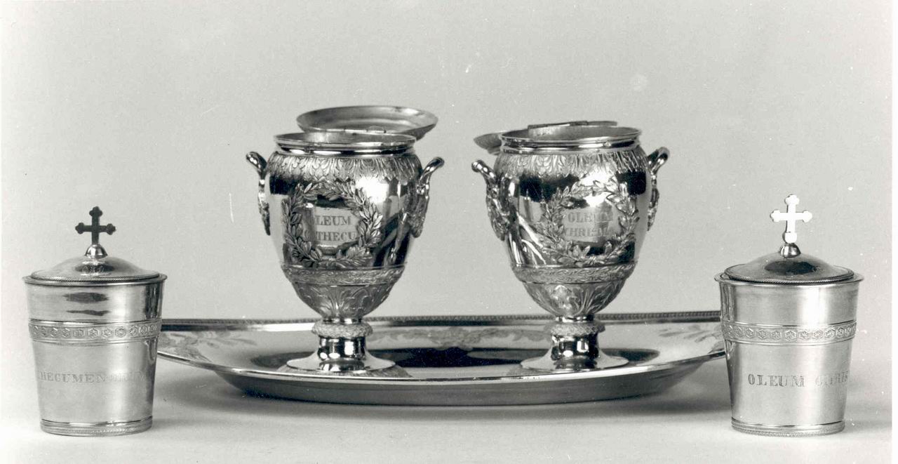 Il servizio si compone di due ampolline con coperchio, contenenti ciascuna un vasetto con coperchio. Le ampolline sono fissate ad un vassoio di forma ovale. Le ampolline hanno piede circolare con bordo decorato a palmette. Fusto con anello a corona di alloro. Corpo: nella parte inferiore motivo a foglie stilizzate profilato da fascia analoga; al centro iscrizione su due righe entro corona d'alloro a rilievo; parte superiore, in prossimità del collarino, decoro a palmette. Lateralmente due anse, attaccatura con motivi vegetali. Al versatoio è fissato, con cerniera, il coperchio ornato alle estremità da motivo a palmette e sormontato da corona. Vasetti interni con corpo a sezione circolare, base profilata, ornati, nella parte superiore, da fascia cesellata con motivi geometrici; coperchio sormontato da croce; iscrizione su una riga nella parte centrale. Vassoio di forma ovale; la tesa è decorata da 4 motivi floreali e a voluta cesellati e profilata da bordo con decoro a dentelli