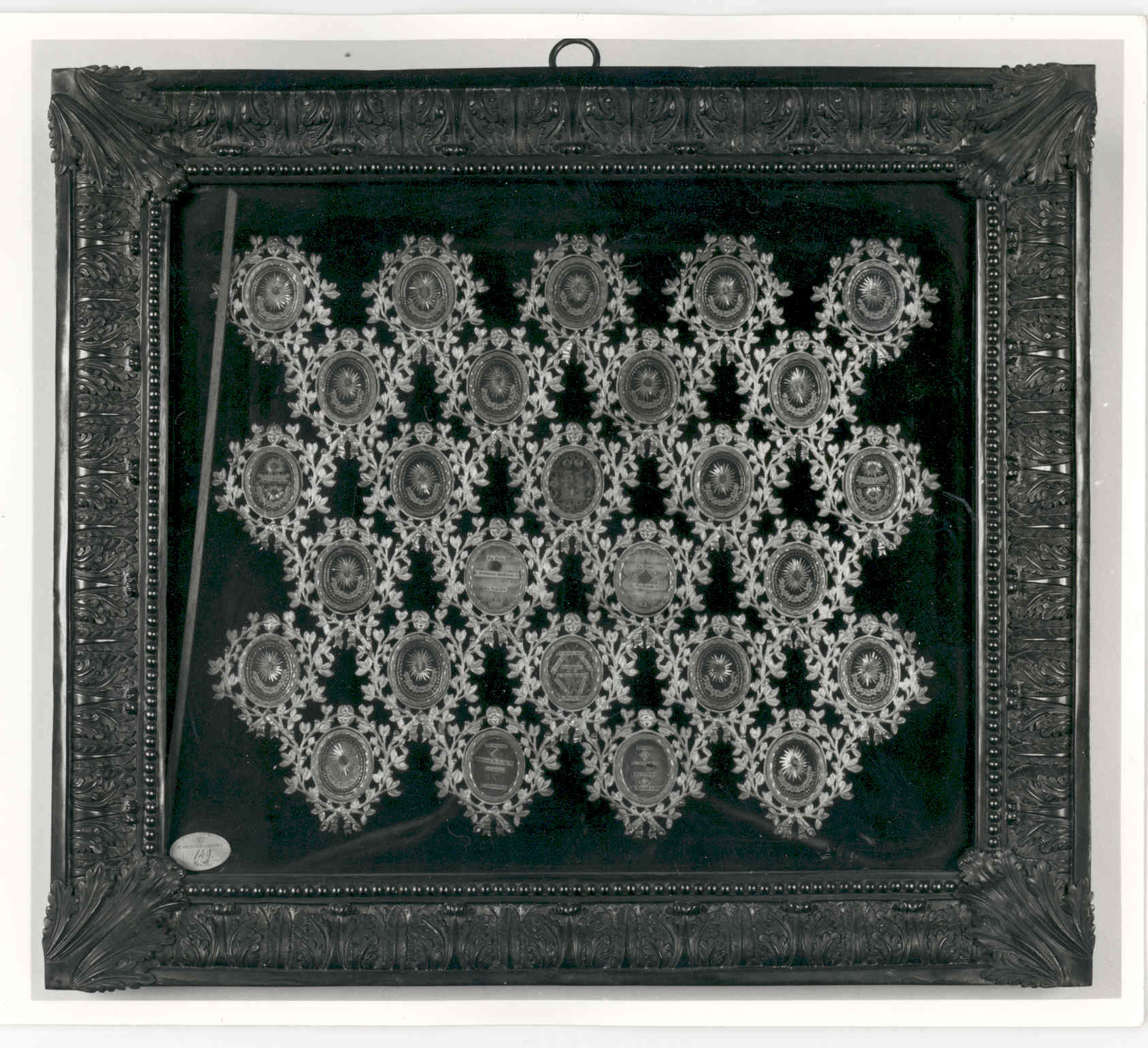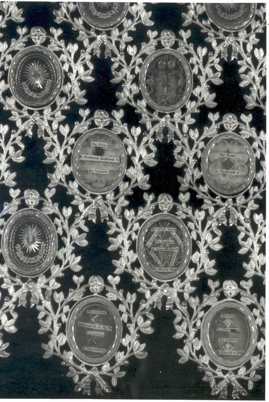 Cornice con profilo e luce rettangolare con vetro. Tipologia a gola; battuta liscia. Sulla fronte rivestimento in ottone argentato, lavorato a sbalzo e cesellato. Fascia interna perlinata; ampia fascia centrale con motivo continuo a coppie di foglie stilizzate affrontate alternate ad elementi floreali. Foglie di acanto accartocciate in corrispondenza degli angoli. Profilo esterno liscio; sul retro, in alto, gancio metallico circolare per sospensione. All'interno, su un fondo in velluto tagliato ad un corpo nero, sono collocati 27 reliquiari a medaglione disposti a scacchiera su sei file. Ciascuno di essi è incastonato in maglie in lamina d'argento sbalzata e cesellata costituite da due rami di alloro uniti da nastro. 21 reliquiari, all'interno, presentano decori in carta variamente ripiegata e tagliata, dorata o colorata, profilatura della cornice in cannutiglia argento ed oro; la reliquia è adagiata su carta dorata tagliata a raggera e, al di sotto, è posto cartiglio sagomato