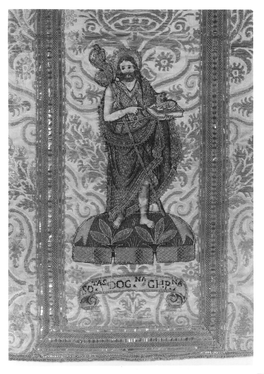 - ISCRIZIONI ai piedi dell'immagine sacra - SO.TAS DOC.NA CHR.NA - lettere capitali - a ricamo - latino