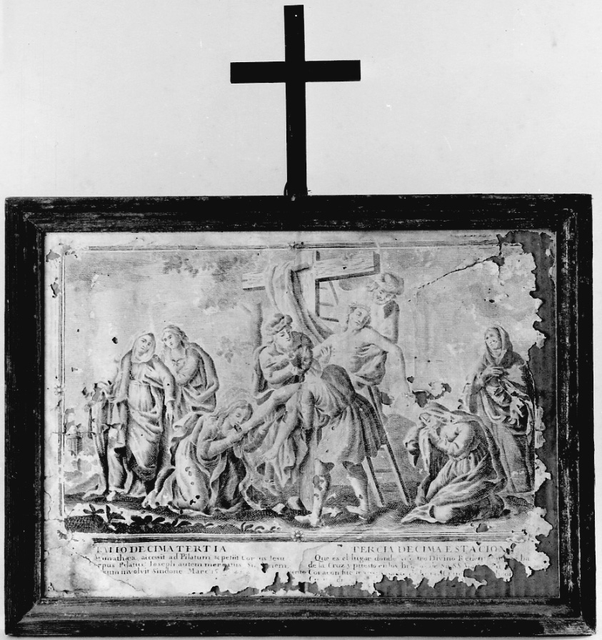 Soggetti sacri. Personaggi: Cristo; Madonna; Santa Maria Maddalena; San Giovanni Evangelista; Nicodemo; Giuseppe d'Arimatea. Figure: figure femminili. Abbigliamento religioso. Oggetti: croce; corona di spine; scala; sacro lino. Paesaggi: rocce; arbusti; alberi