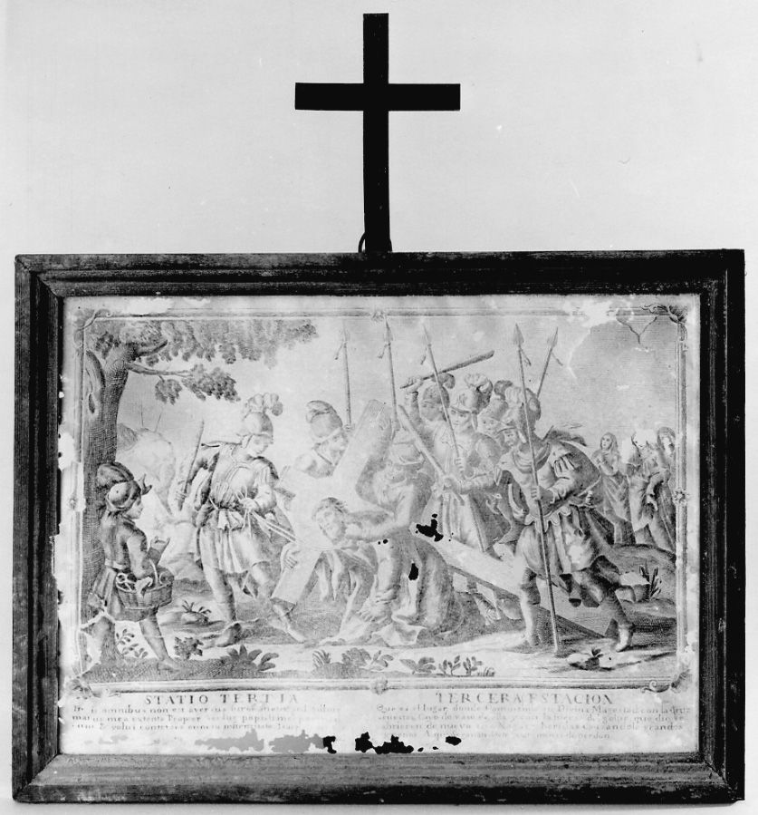 Soggetti sacri. Personaggi: Cristo. Figure: soldati; figure femminili; nano. Abbigliamento. Oggetti: croce; corona di spine; armature; elmi; bastoni; cesto; corda. Armi: lance. Paesaggi: rocce; arbusti; albero