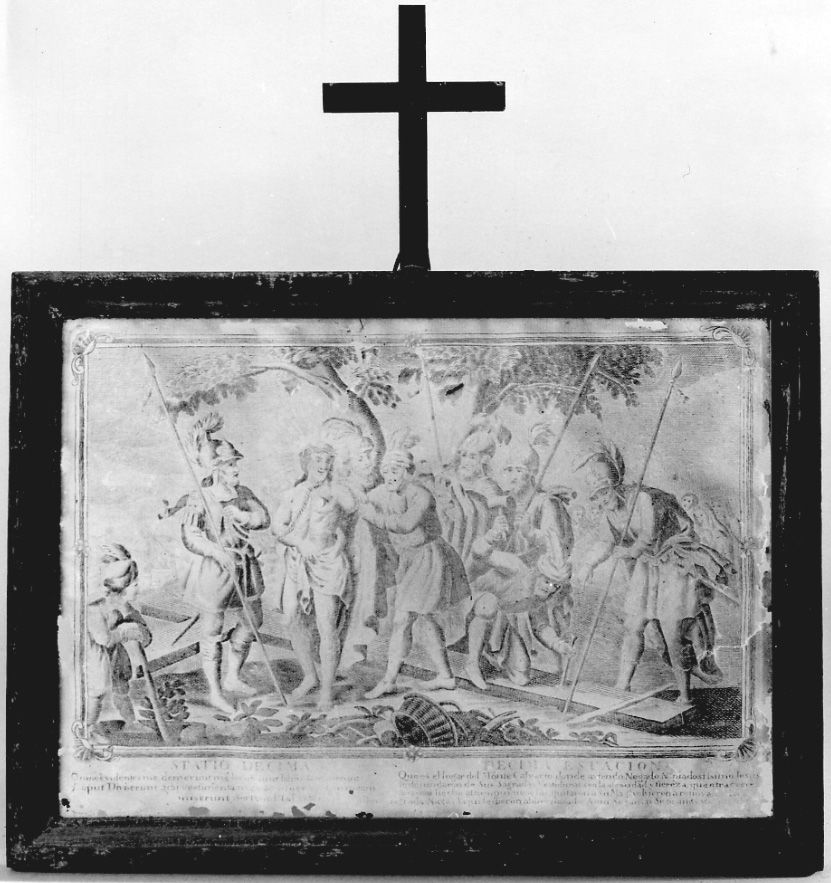 Soggetti sacri. Personaggi: Cristo. Figure: soldati; nano; figure femminili. Abbigliamento. Oggetti: croce; corona di spine; armature; elmi; martello; chiodi; cesto; corda. Armi: lance. Paesaggi: rocce; arbusti; alberi
