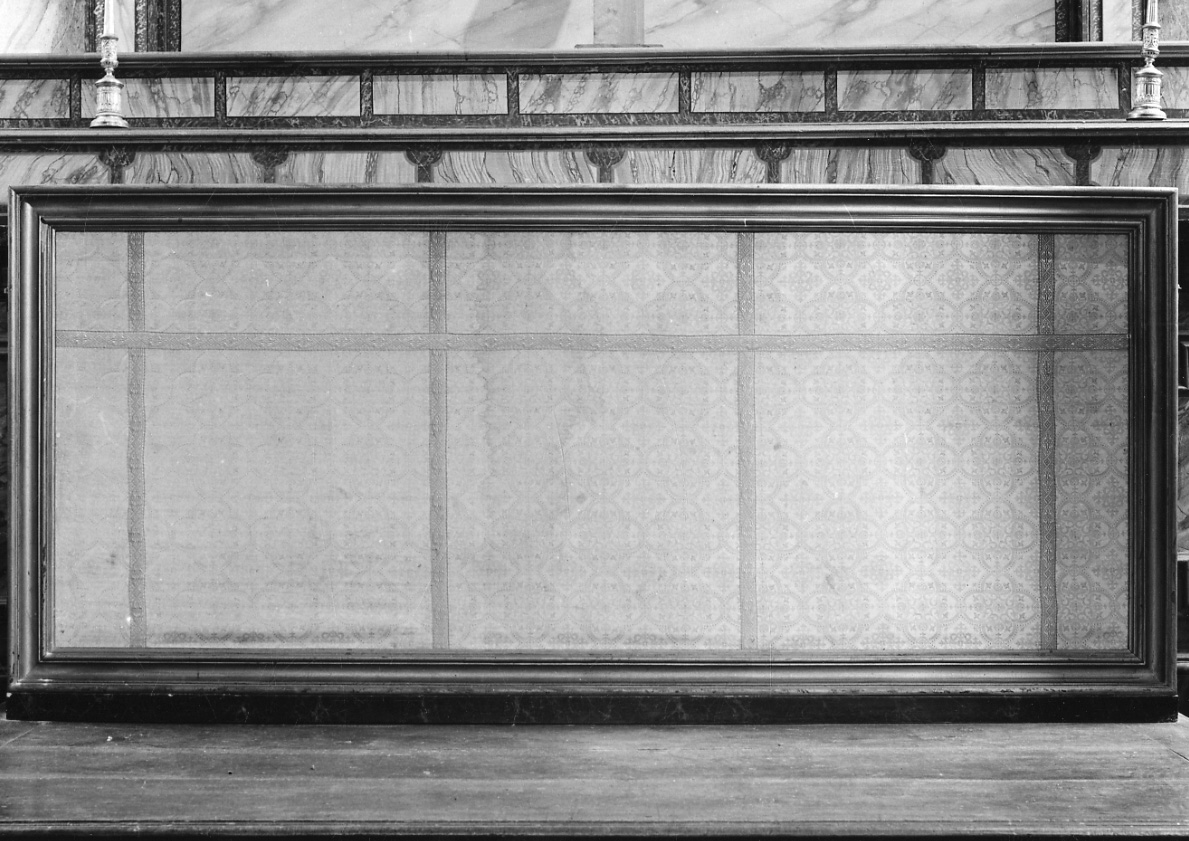 La cornice presenta uno zoccolo dipinto a finta marezzatura nei colori nero, grigio