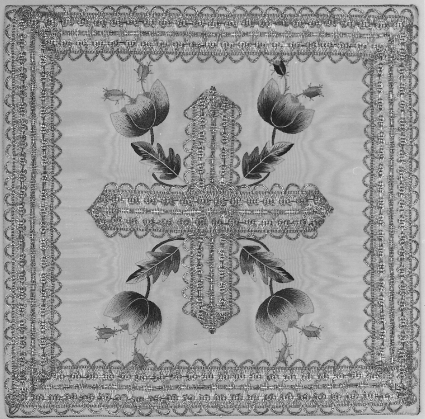 Fondo avorio moirè con motivi a ricamo in seta policroma (blu, rosa, verde, giallo), filo dorato. Gallone in filo dorato. Fodera: raso rosso