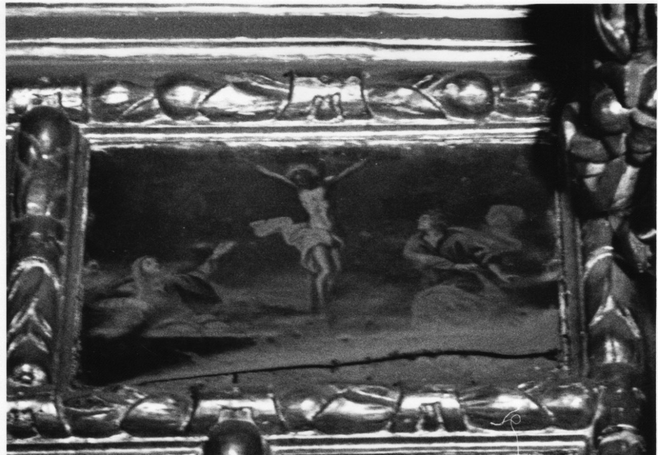 Cristo crocifisso sul Golgota al centro della scena è affiancato dalla Vergine a sinistra e da san Giovanni Evangelista sulla destra