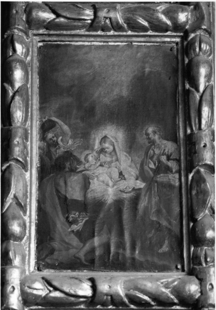 La Vergine affiancata da Giuseppe, porge il neonato Gesù all'adorazione dei pastori; una figura maschile è colta di spalle, inginocchiata davanti al Bambino, mentre una donna occupa il lato destro della composizione