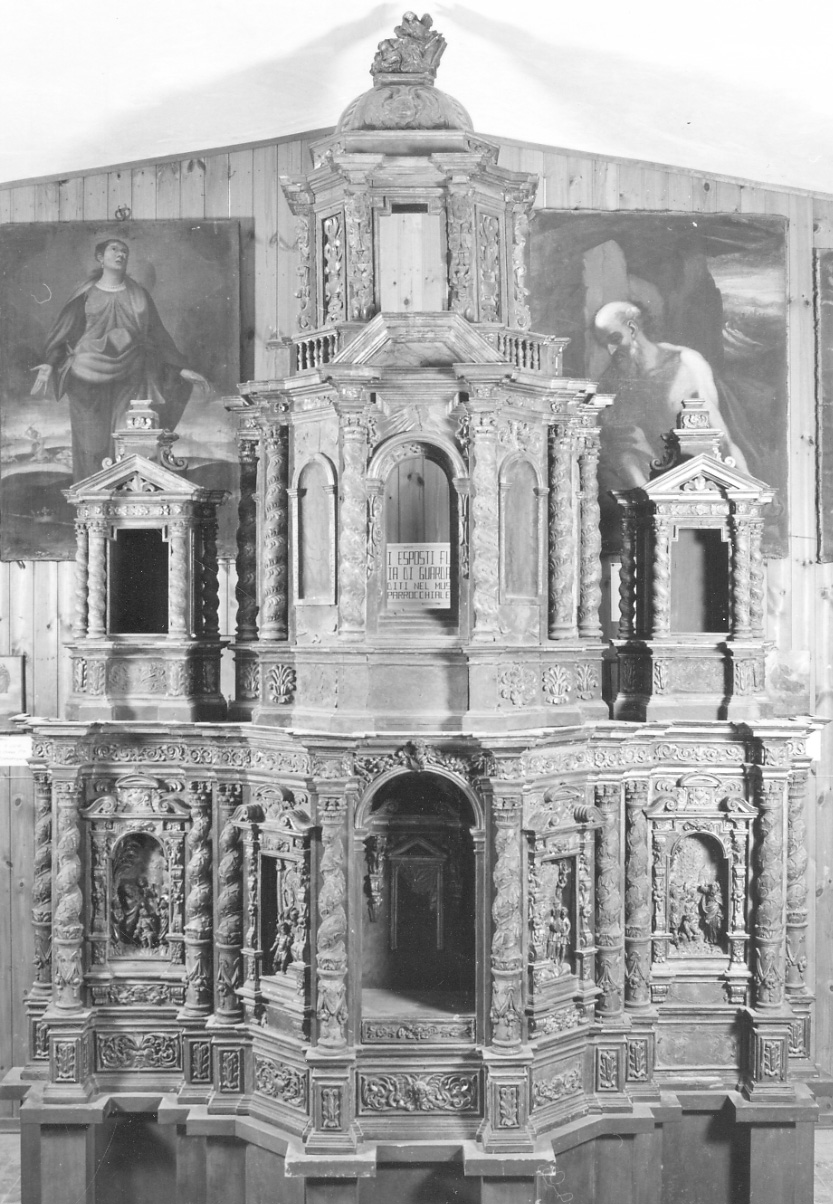 - NOTIZIE STORICO CRITICHE L'altare, ritornato a Guardabosone da tre anni circa, dopo essere stato esposto e custodito al Museo Leone di Vercelli, è confrontabile con l'ancona piramidale oggi nel Palazzo dei Principi di Masserano (in origine nella chiesa collegiata, poi nella chiesa di San Teonesto del medesimo paese). Quest'ultima è databile ante 1654 grazie ad un documento della Biblioteca Reale di Torino, che ne riporta l'attribuzione a Teribinto d'Arona (Bartolomeo Tiberino). Bibliografia di confronto: V. BARALE, Il principato di Masserano ed il Marchesato di Crevacuore, 1966, p. 105