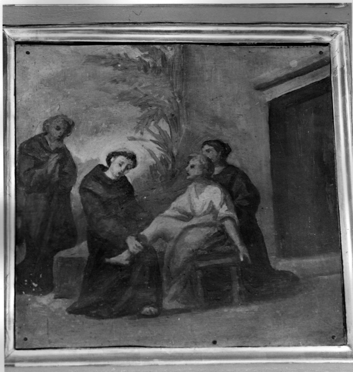Sant'Antonio da Padova, in abito monacale, accompagnato da un confratello, che rimane in piedi alle sue spalle, riattacca miracolosamente il piede ad un ragazzo
