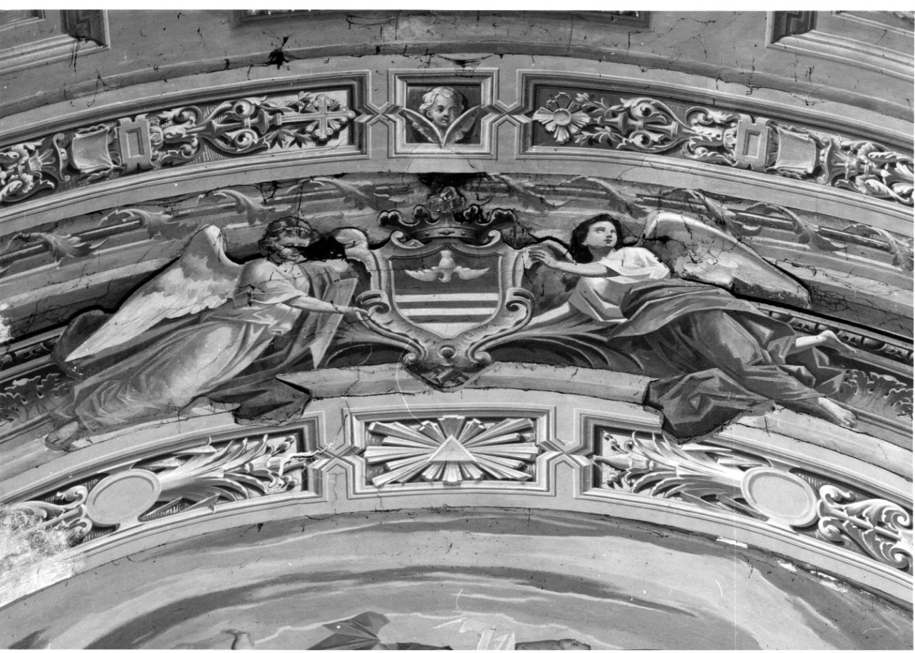 Coppia di angeli con ampie vesti drappeggiate e grandi ali, sorreggono con entrambe le mani uno stemma araldico