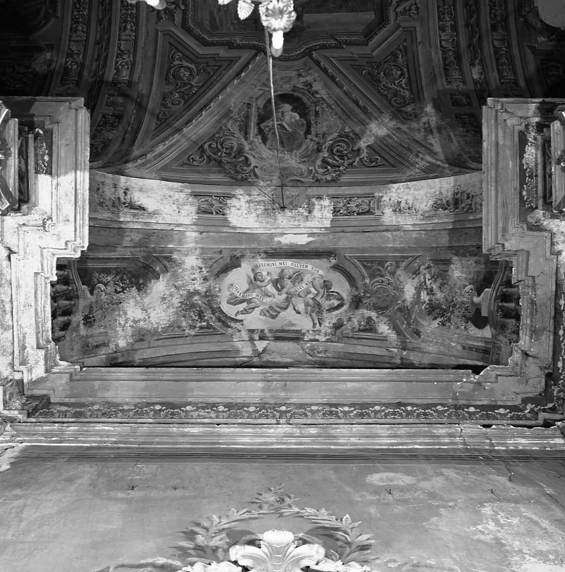 All'interno di una cornice mistilinea, tre piccoli angeli, con le ali spiegate, volteggiano reggendo un cartiglio con l'iscrizione