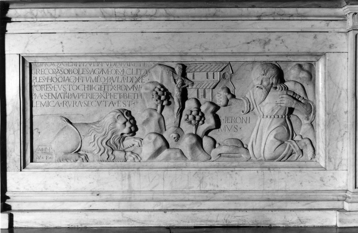 Il rilievo raffigura S. Girolamo penitente a destra, il Golgota con il Crocifisso al centro, il leone a sinistra, una chiesa nel fondo