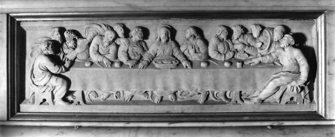 Soggetti sacri. Personaggi: Cristo; apostoli. Abbigliamento. Interno. Mobilia: tavola. Oggetti: posate; bicchiere; pane