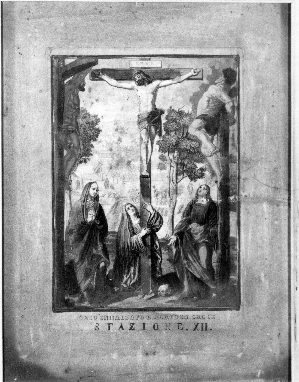 - ISCRIZIONI al di sotto del soggetto - GESU' INNALZATO E MORTO IN CROCE/ STAZIONE. XII - lettere capitali -