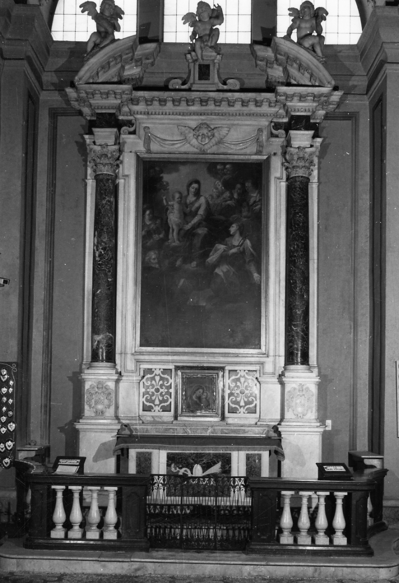L'altare è composto da uno sfondo in marmo bianco, coronato da un timpano curvilineo spezzato nella zona centrale che ospita un angelo issato su di un podio. La decorazione della cimasa è completata da due statue laterali mollemente adagiate sull'estradosso del timpano. Unico elemento di contrasto le due colonne corinzie in marmo scuro poste su alti basamenti recanti l'arme sotto descritto. Di notevole spicco gli scomparti laterali del registro inferiore, lavorati ad intarsio marmoreo (rosso, bianco) su motivi geometrici