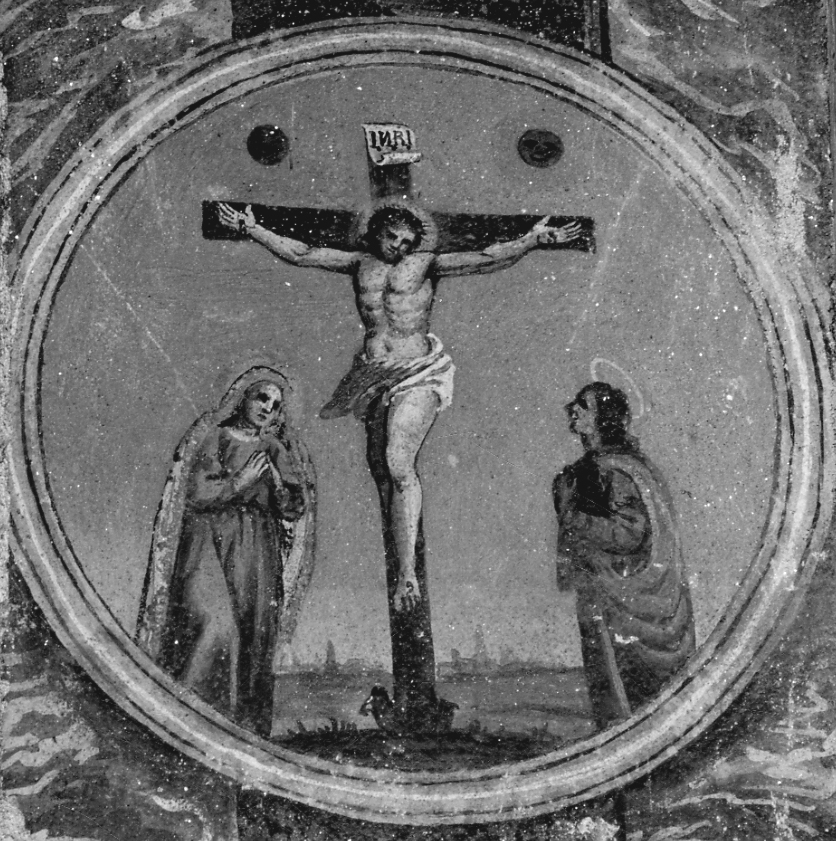 Gesù crocifisso, a sinistra Maria e a destra S. Giovanni Evangelista. Fondo: cielo, luna, sole