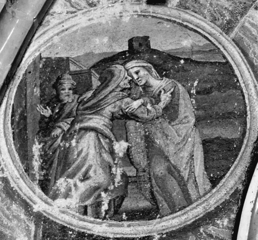 Maria abbraccia Elisabetta; a sinistra figura maschile. Fondo: colline; mura