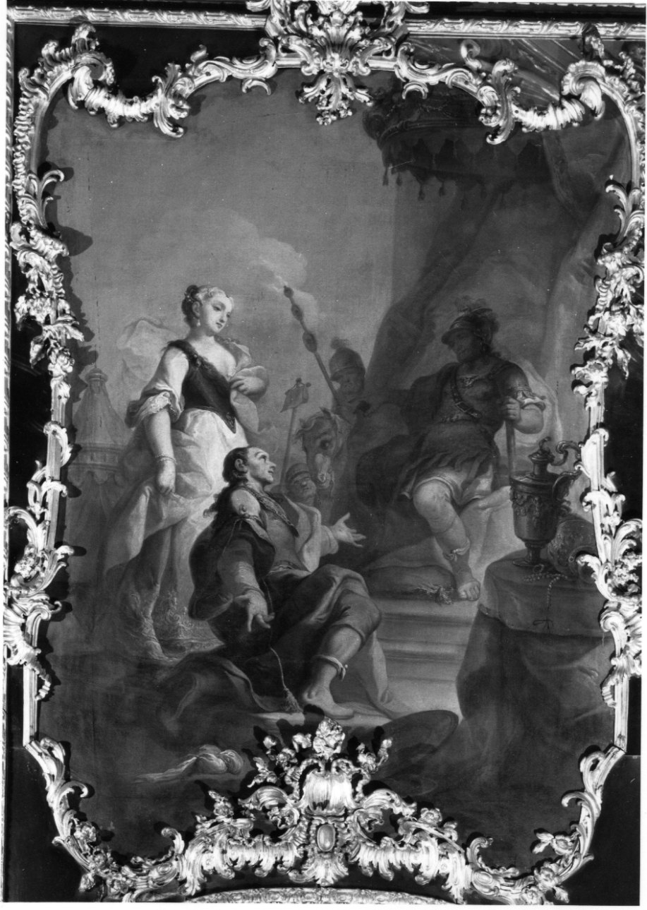 Cornice intagliata e dorata, con luce mistilinea all'interno della quale si dispone la tela; l'impertore è rappresentato seduto, in armatura; al suo cospetto, un uomo inginocchiato accompagnato da una donna in piedi. La scena è ambientata nell'accampamento